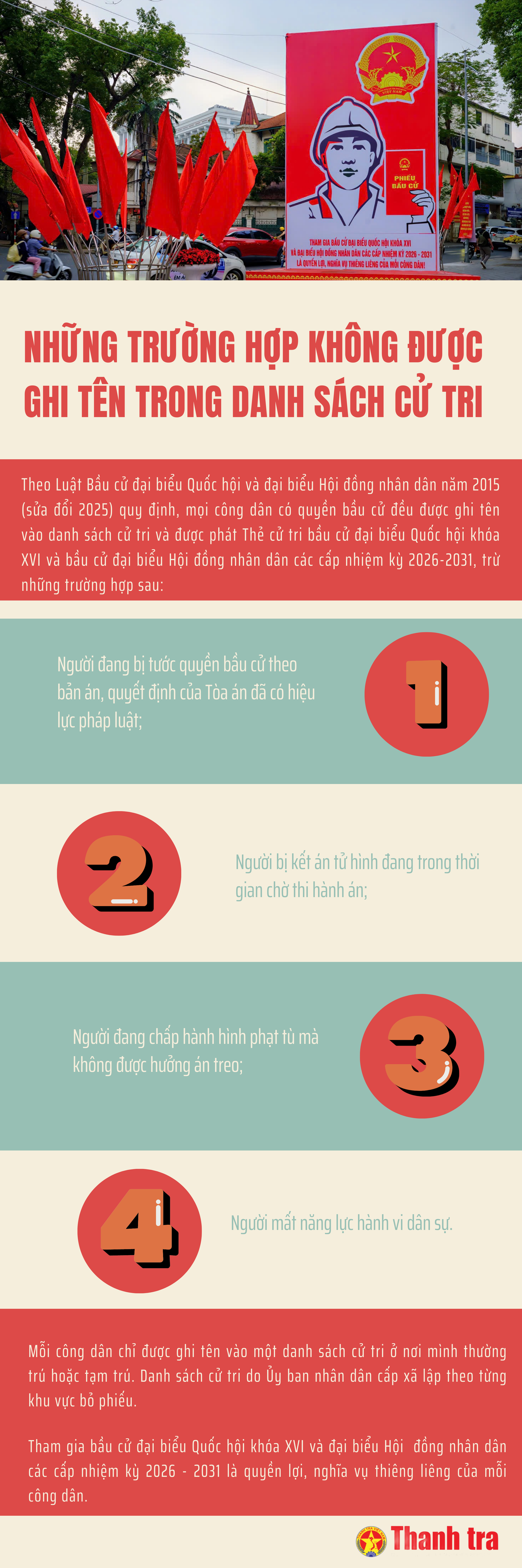 (Thanh tra) - Danh sách cử tri do UBND cấp xã lập theo từng khu vực bỏ phiếu. Luật Bầu cử đại biểu Quốc hội và đại biểu HĐND quy định một số trường hợp không được ghi tên vào danh sách cử tri.