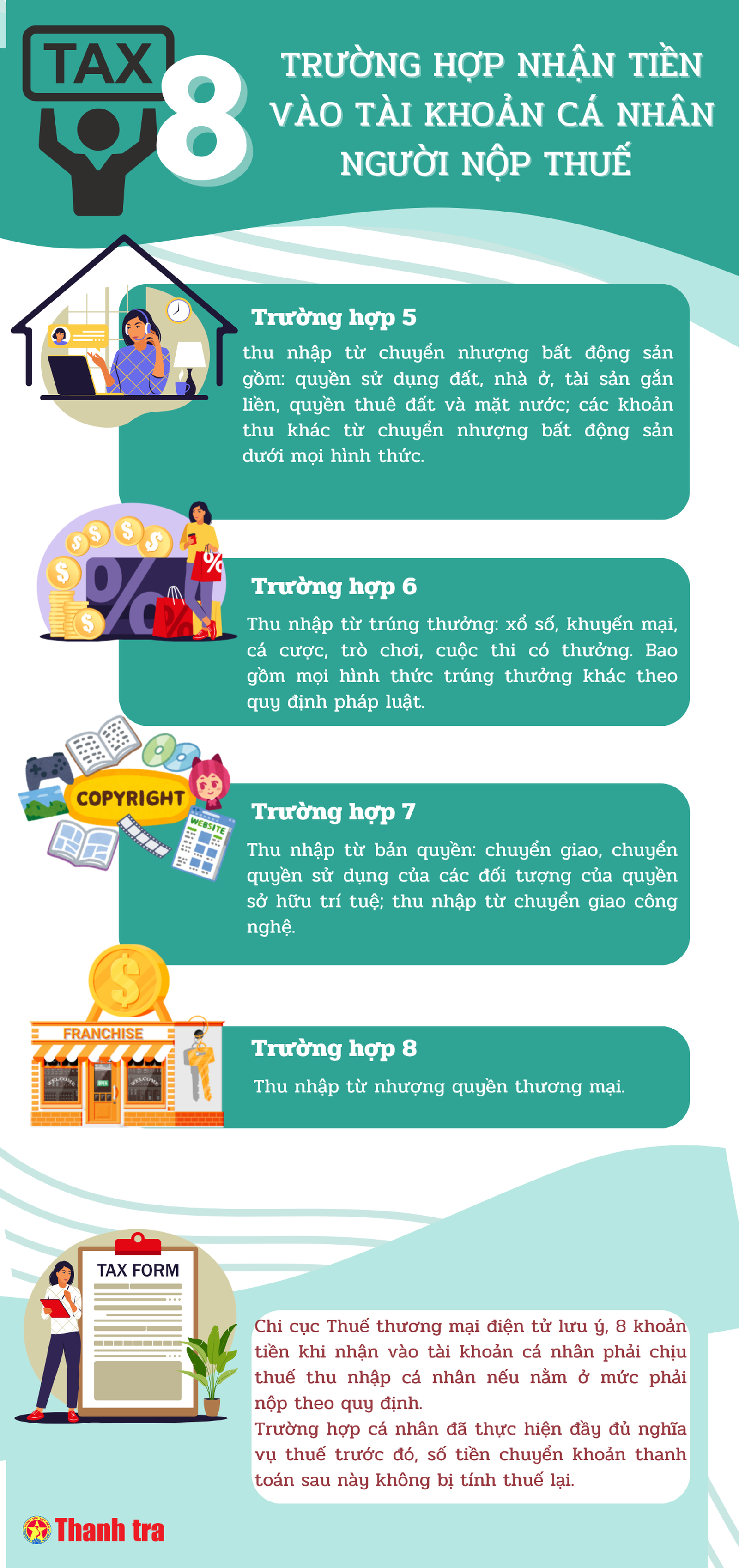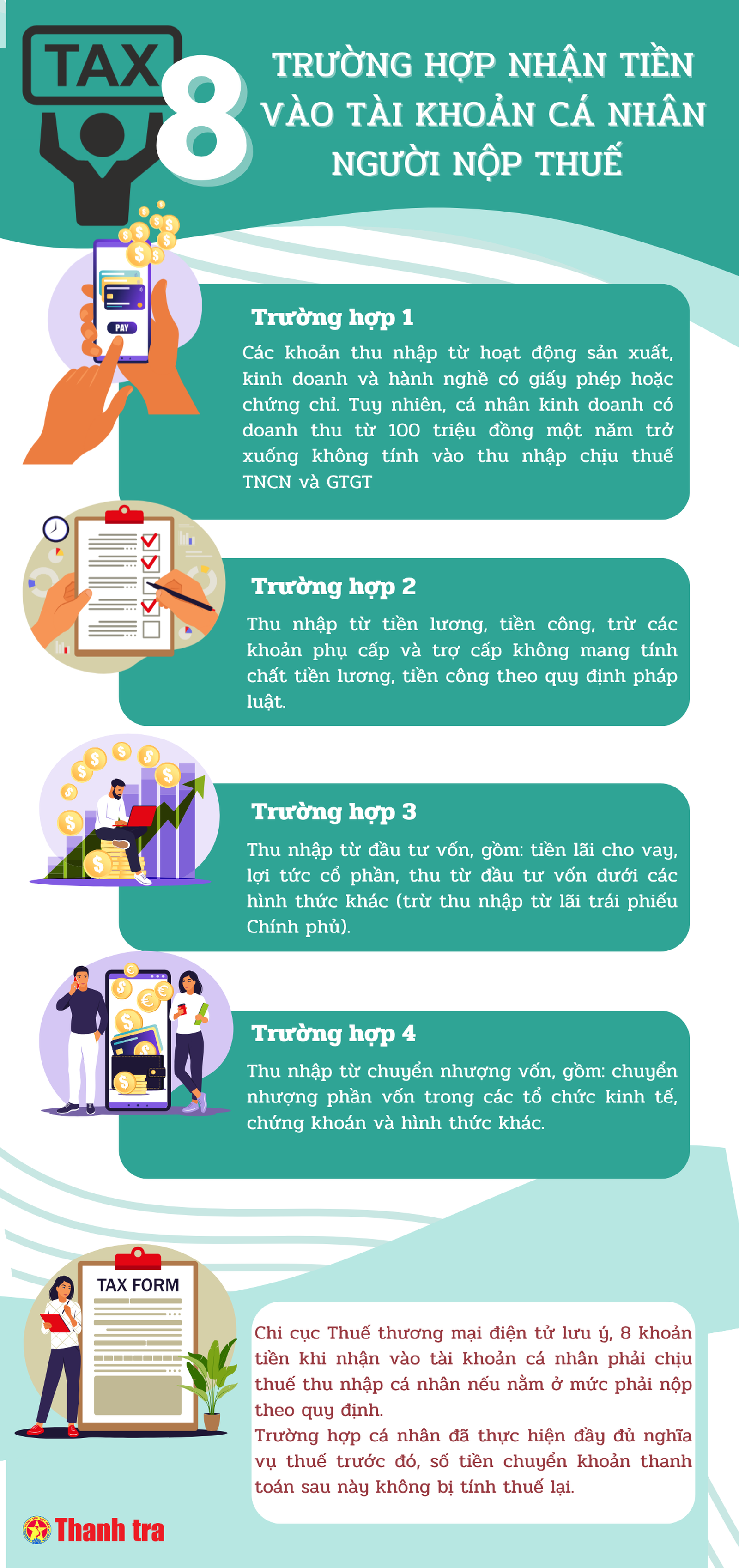 (Thanh tra) - Chi cục Thuế Thương mại điện tử - Cục Thuế mới đây đã đưa ra khuyến cáo, các khoản tiền chuyển vào tài khoản cá nhân như thu nhập từ kinh doanh, đầu tư, chuyển nhượng, trúng thưởng… có thể phải nộp thuế thu nhập cá nhân nếu không thuộc diện miễn hoặc vượt ngưỡng quy định.