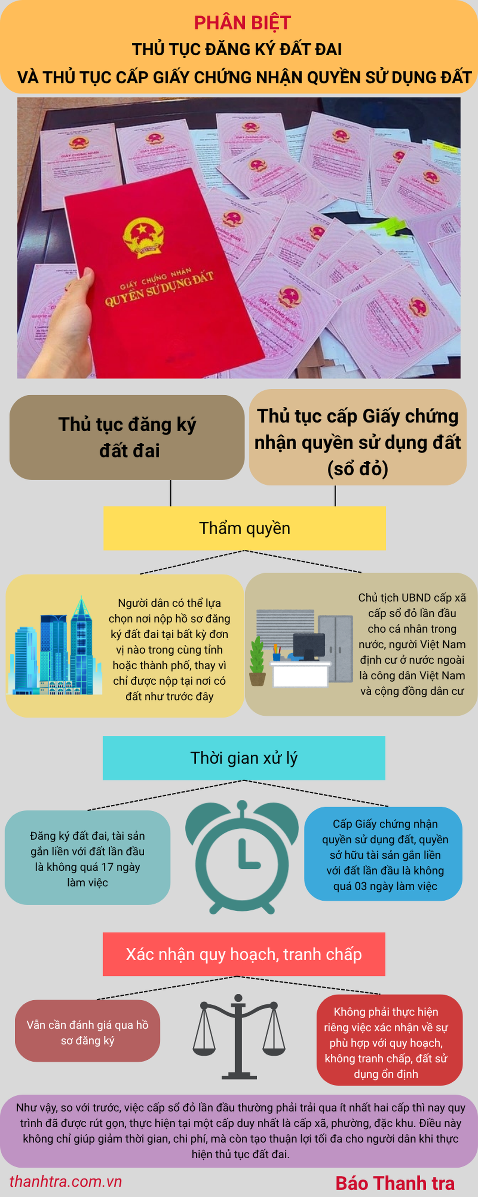 (Thanh tra) - Từ ngày 1/7/2025, Chủ tịch UBND cấp xã sẽ có thẩm quyền ký cấp giấy chứng nhận quyền sử dụng đất (sổ đỏ) lần đầu cho cá nhân trong nước, người Việt Nam định cư ở nước ngoài là công dân Việt Nam và cộng đồng dân cư. Song người dân cần lưu ý, phân biệt rõ quy trình đăng ký đất đai và thủ tục cấp sổ đỏ theo quy định tại Nghị định 151/2025/NĐ-CP.
