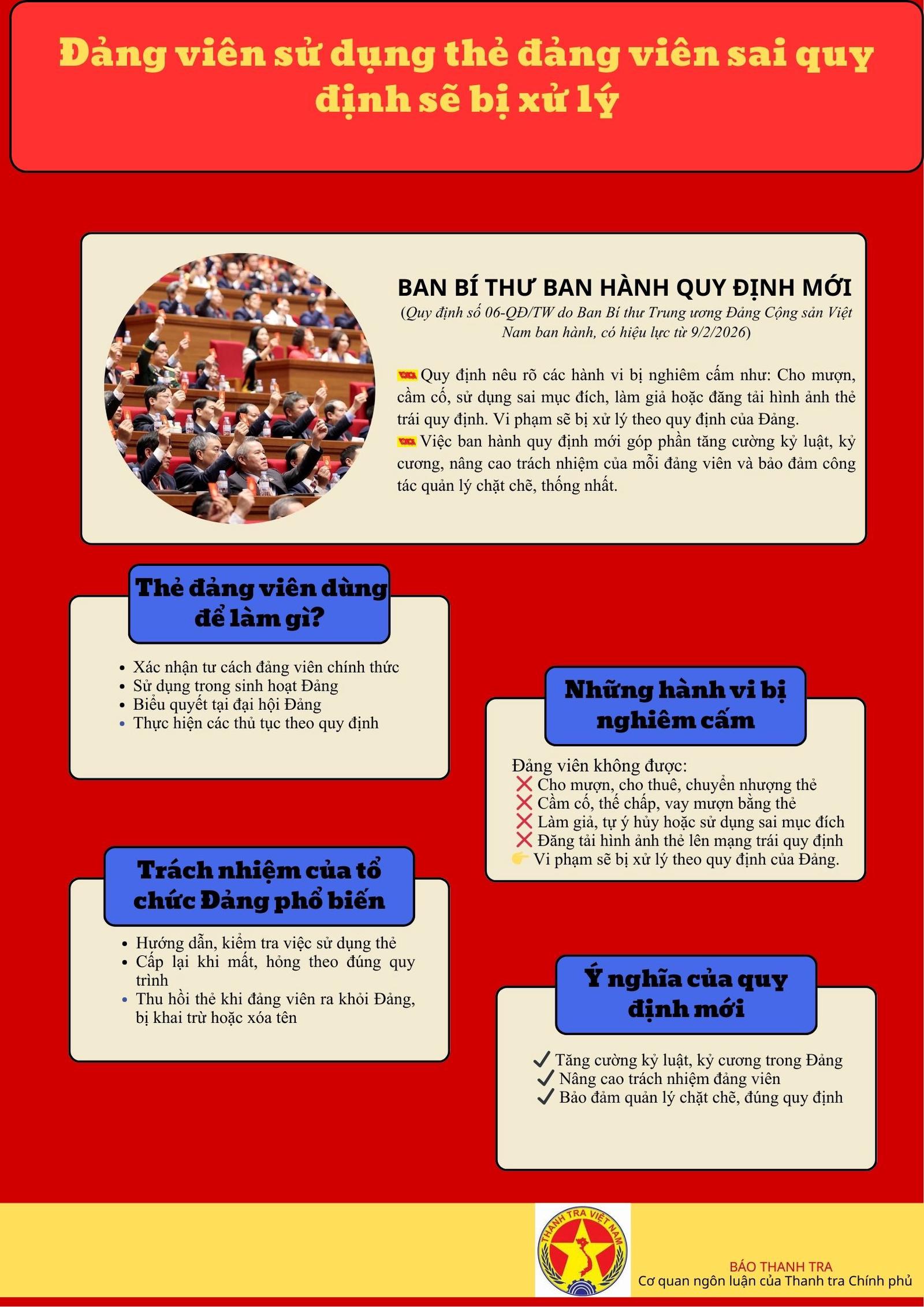 (Thanh tra) - Thay mặt Ban Bí thư, đồng chí Trần Cẩm Tú, Ủy viên Bộ Chính trị, Thường trực Ban Bí thư đã ký ban hành Quy định về quản lý và sử dụng thẻ đảng viên (Quy định số 06-QĐ/TW).