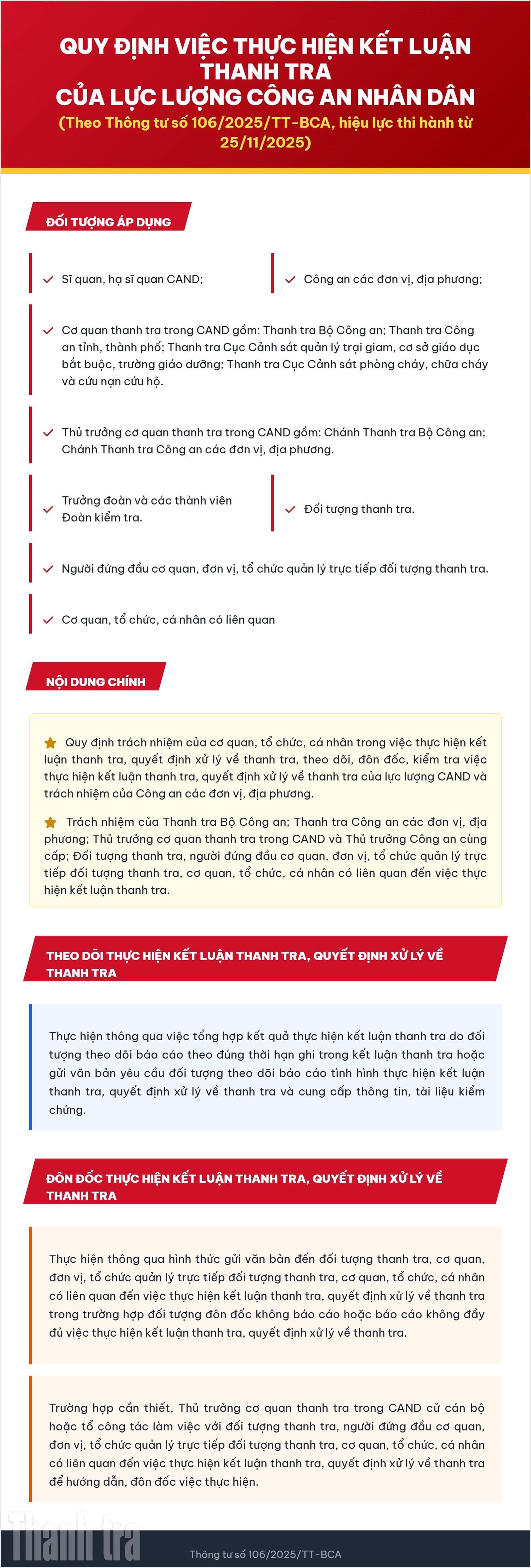 (Thanh tra) - Bộ trưởng Bộ Công an Lương Tam Quang đã ký ban hành Thông tư số 106/2025/TT-BCA quy định việc thực hiện kết luận thanh tra của lực lượng Công an nhân dân; có hiệu lực thi hành từ 25/11/2025.