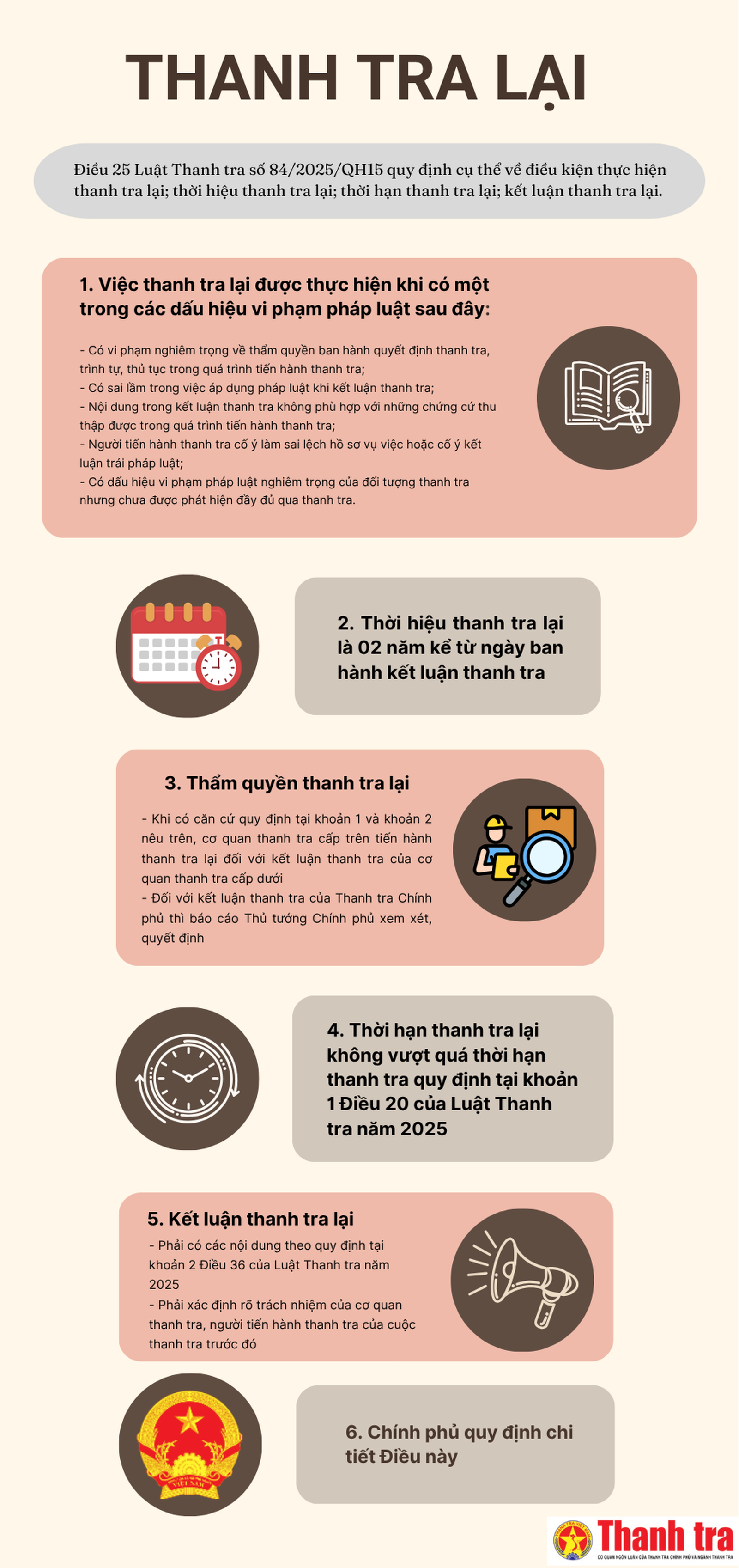 (Thanh tra) - Nhằm đảm bảo tính nghiêm minh của pháp luật trong hoạt động thanh tra, Điều 25 Luật Thanh tra năm 2025 quy định cụ thể việc thanh tra lại khi có các dấu hiệu vi phạm pháp luật.