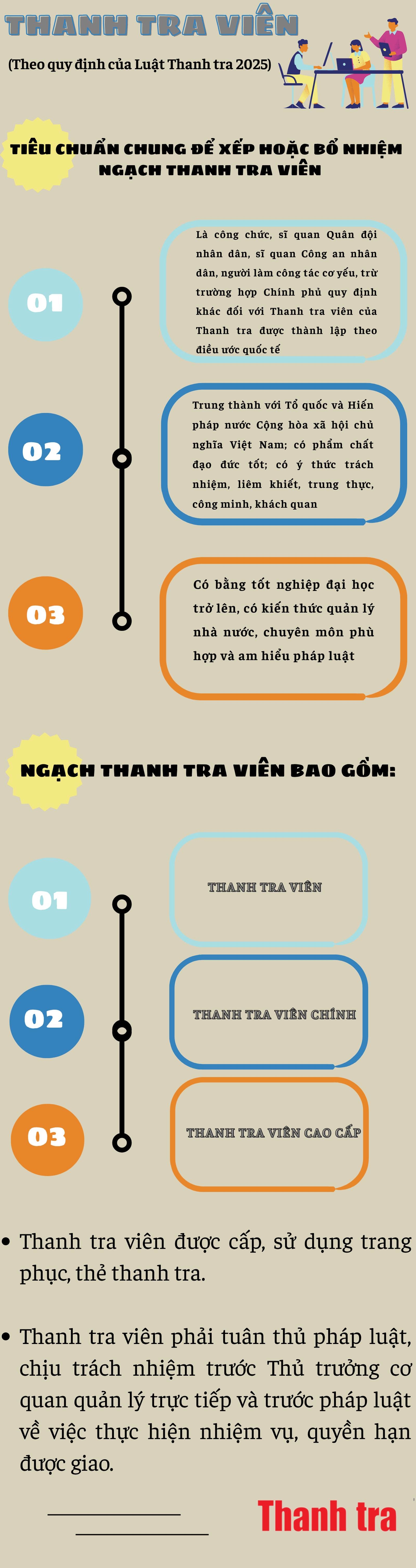 (Thanh tra) - Điều 8, Luật Thanh tra năm 2025 quy định, Thanh tra viên là người được xếp hoặc bổ nhiệm vào ngạch Thanh tra viên trong các cơ quan thanh tra để thực hiện nhiệm vụ, quyền hạn trong hoạt động thanh tra theo quy định của pháp luật.