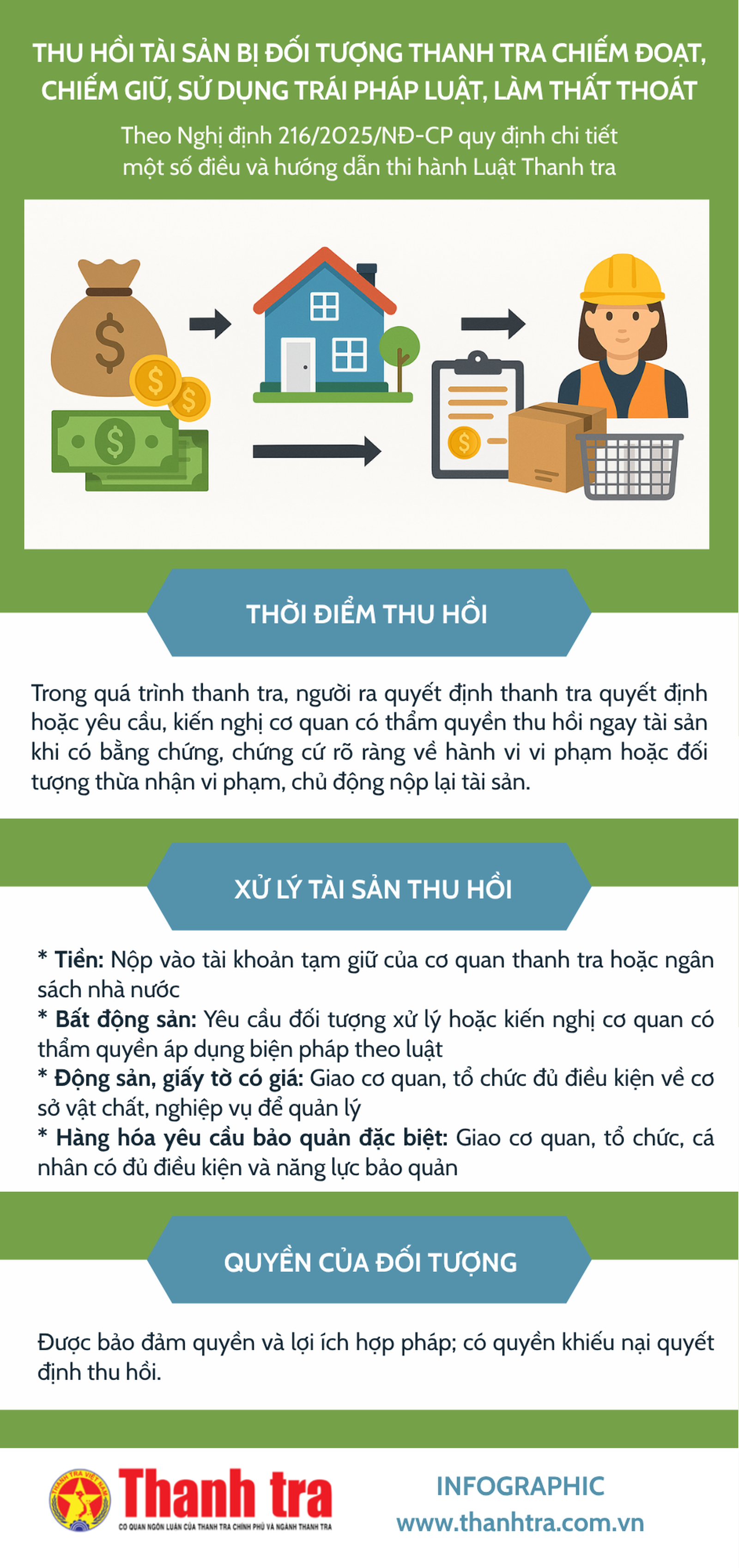 (Thanh tra) - Theo Luật Thanh tra, người ra quyết định thanh tra ra quyết định thu hồi tài sản khi phát hiện đối tượng thanh tra có hành vi chiếm đoạt, chiếm giữ, sử dụng trái pháp luật hoặc làm thất thoát tài sản của Nhà nước mà không phải đợi kết luận thanh tra. Chính phủ đã quy định chi tiết nội dung này tại Nghị định 216/2025/NĐ-CP ngày 5/8/2025.
