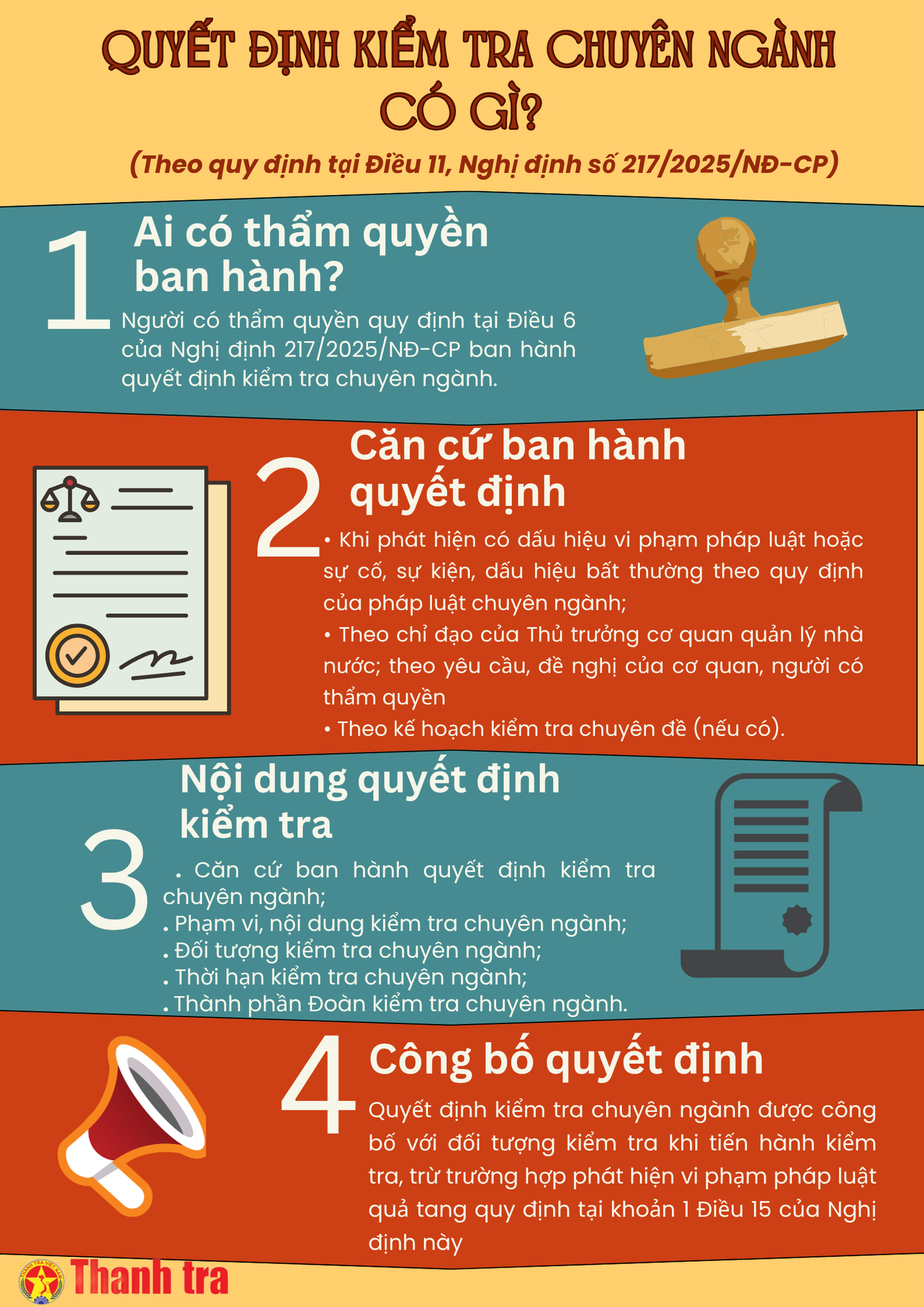 (Thanh tra) - Quyết định kiểm tra chuyên ngành là văn bản pháp lý quan trọng để triển khai công tác kiểm tra theo đúng quy định của pháp luật. Điều 11 của Nghị định 217/2025/NĐ-CP quy định rõ thẩm quyền, căn cứ ban hành, nội dung và quy trình công bố quyết định kiểm tra.