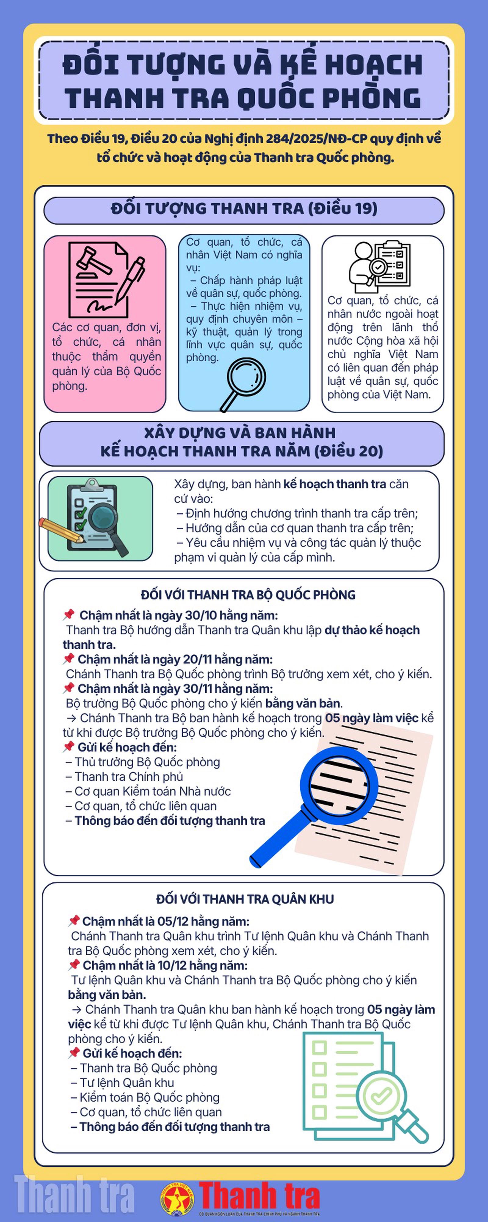 (Thanh tra) - Các quy định về đối tượng thanh tra và quy trình xây dựng kế hoạch thanh tra hằng năm của Thanh tra Quốc phòng được cụ thể hóa tại Nghị định số 284/2025/NĐ-CP của Chính phủ quy định về tổ chức và hoạt động của Thanh tra Quốc phòng, góp phần bảo đảm hoạt động thanh tra trong lĩnh vực quân sự, quốc phòng được tiến hành thống nhất, chặt chẽ và đúng thẩm quyền.