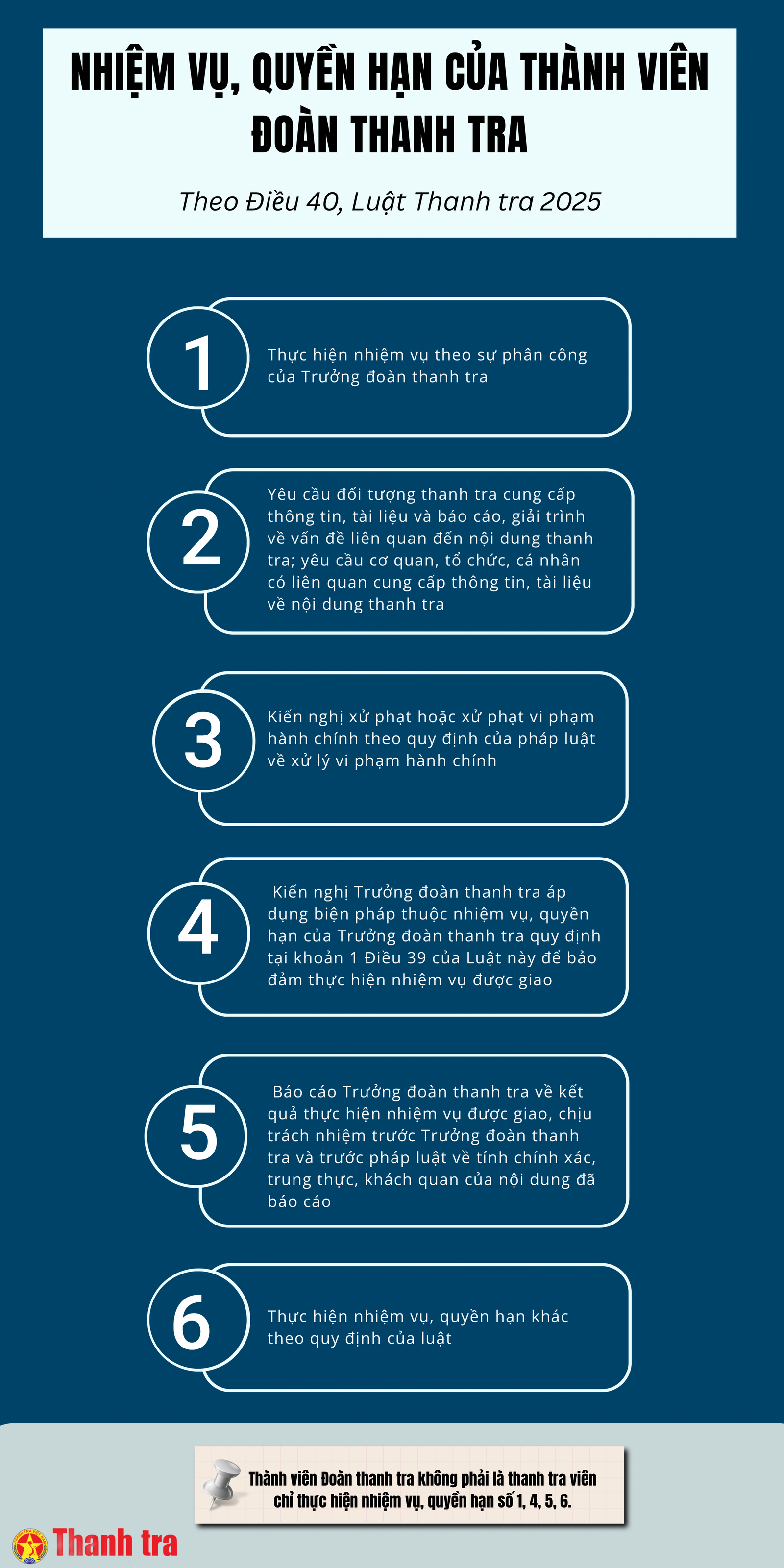 (Thanh tra) - Điều 40, Luật Thanh tra năm 2025 quy định cụ thể nhiệm vụ, quyền hạn của thành viên đoàn thanh tra (bao gồm các thành viên là thanh tra viên và các thành viên khác).