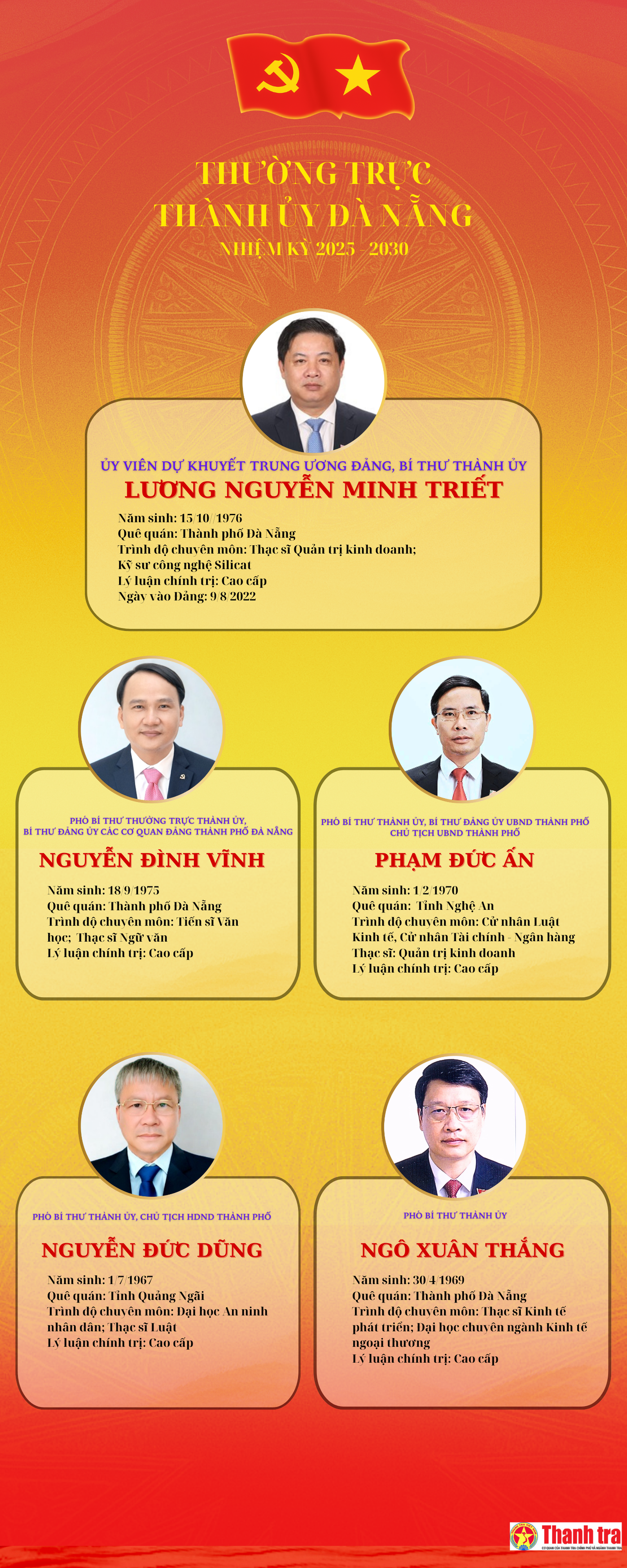 (Thanh tra) - Với tinh thần “Đoàn kết - Dân chủ - Kỷ cương - Sáng tạo - Phát triển”, Đại hội Đảng bộ thành phố Đà Nẵng lần thứ I là dấu mốc lịch sử, định hình tầm nhìn và quyết tâm chính trị cho một thành phố khát vọng bứt phá, vươn lên mạnh mẽ trong kỷ nguyên phát triển mới của dân tộc. Báo Thanh tra trân trọng giới thiệu danh sách các đồng chí Thường trực Thành ủy Đà Nẵng khóa I, nhiệm kỳ 2025 - 2030.