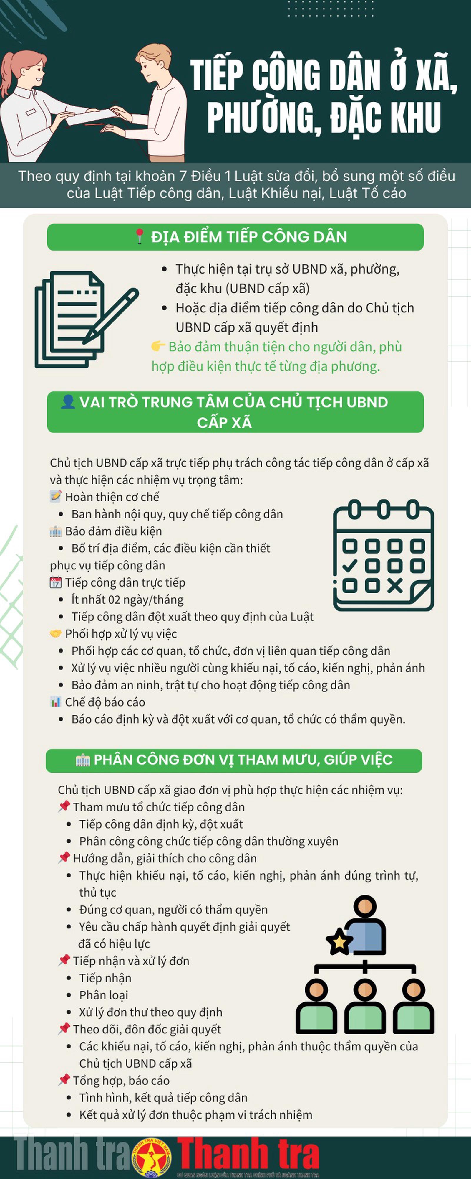 (Thanh tra) - Theo quy định tại Luật sửa đổi, bổ sung một số điều của Luật Tiếp công dân, Luật Khiếu nại, Luật Tố cáo, Chủ tịch UBND cấp xã trực tiếp tiếp công dân ít nhất 2 ngày trong 1 tháng. Bên cạnh việc tiếp dân định kỳ, người đứng đầu chính quyền cơ sở còn có trách nhiệm tiếp dân đột xuất, ban hành nội quy và phối hợp chặt sẽ trong xử lý các vụ việc đông người để đảm bảo an ninh, trật tự tại địa phương.