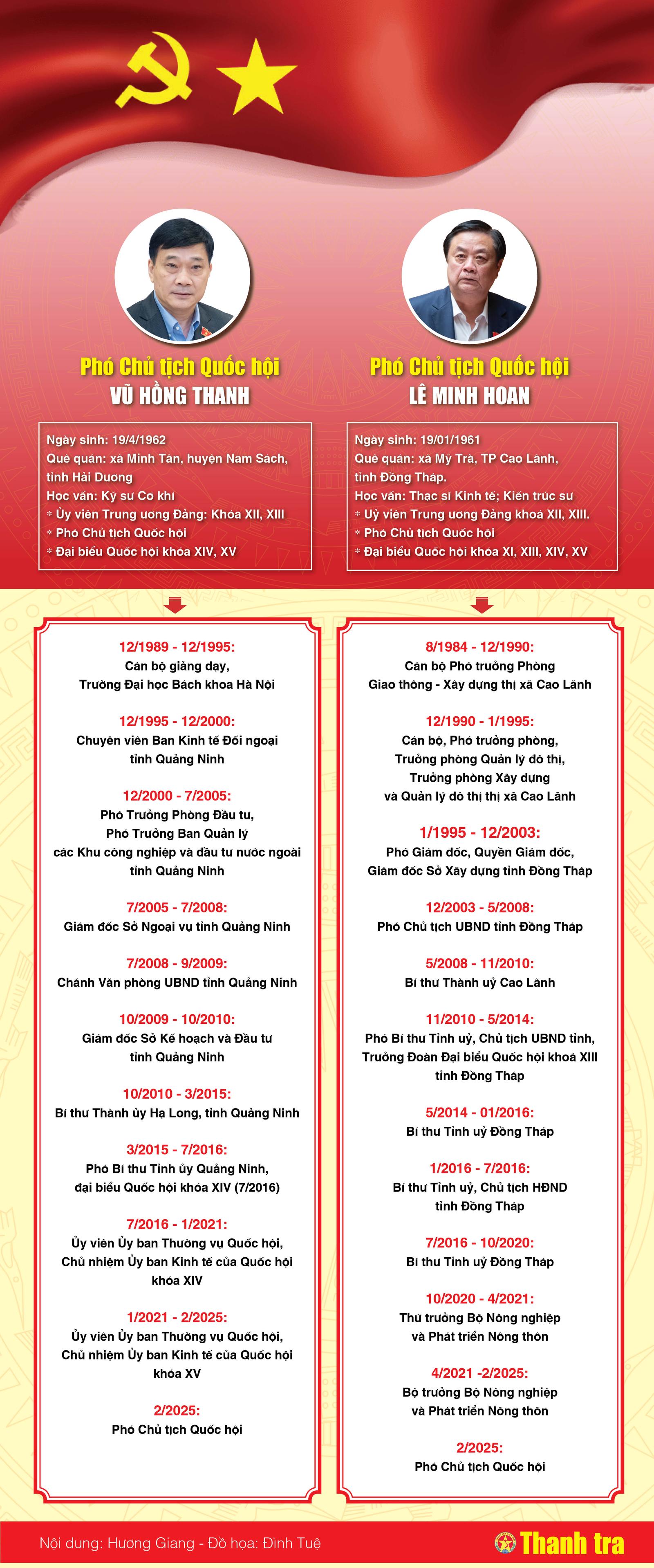(Thanh tra) - Sau nhiều năm công tác tại tỉnh Quảng Ninh, ông Vũ Hồng Thanh đảm nhận nhiệm vụ Chủ nhiệm Ủy ban Kinh tế, rồi được bầu làm Phó Chủ tịch Quốc hội. Còn ông Lê Minh Hoan trưởng thành từ cán bộ ở tỉnh Đồng Tháp, làm Bộ trưởng Nông nghiệp và Phát triển Nông thôn, trước khi được bầu làm Phó Chủ tịch Quốc hội.