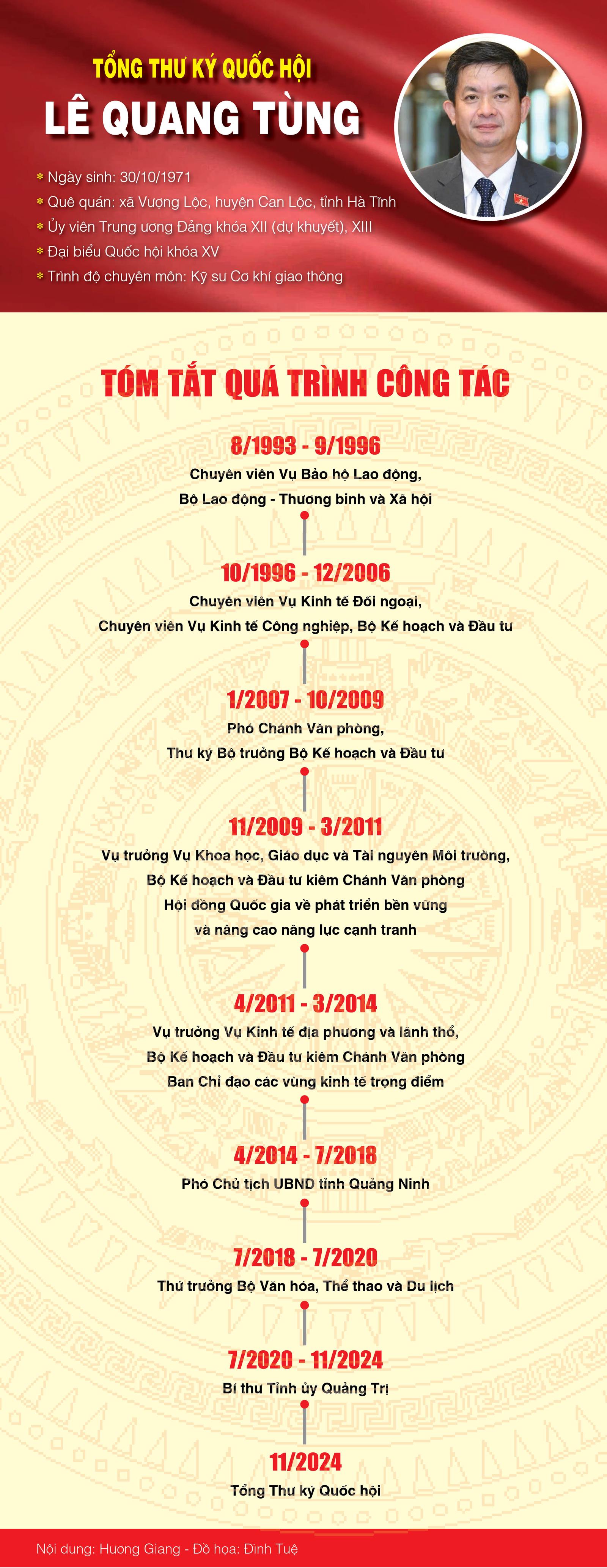 (Thanh tra) - Ông Lê Quang Tùng (sinh năm 1971, quê tỉnh Hà Tĩnh) là cán bộ có quá trình công tác tại nhiều bộ, ngành, địa phương khác nhau. Trước khi được bầu làm Ủy viên Ủy ban Thường vụ Quốc hội, Tổng Thư ký Quốc hội, ông là Bí thư Tỉnh ủy Quảng Trị.