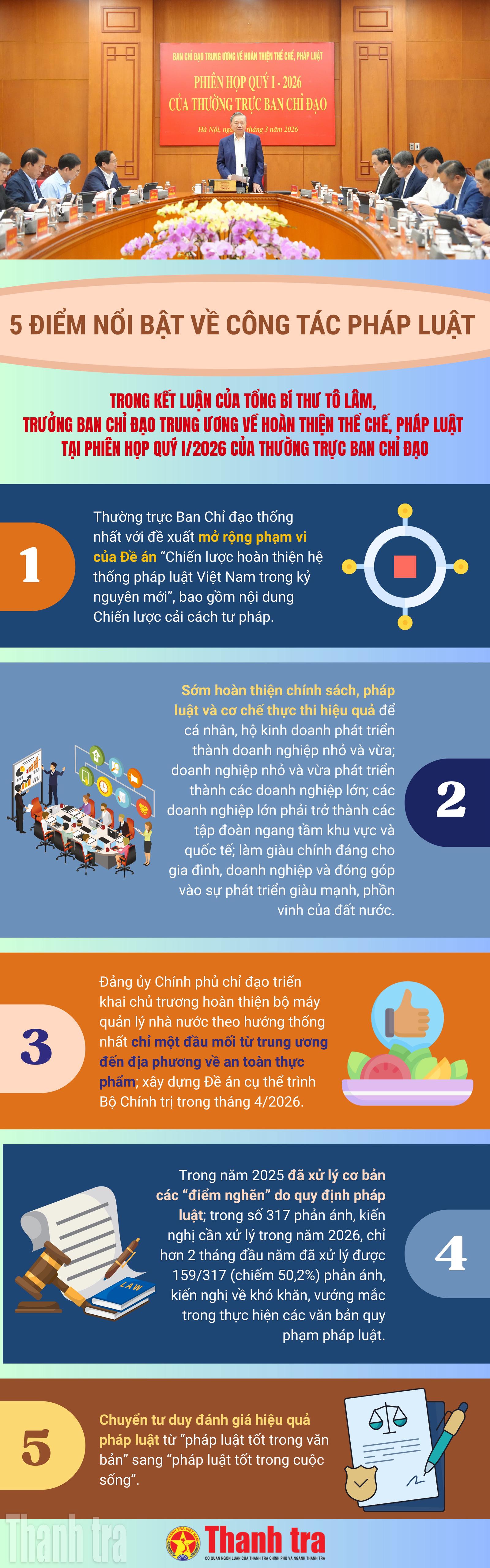(Thanh tra) - Thông báo kết luận của Tổng Bí thư Tô Lâm, Trưởng Ban Chỉ đạo Trung ương về hoàn thiện thể chế, pháp luật tại Phiên họp quý I/2026 của Thường trực Ban Chỉ đạo đã nêu rõ “5 điểm nổi bật về công tác pháp luật”.