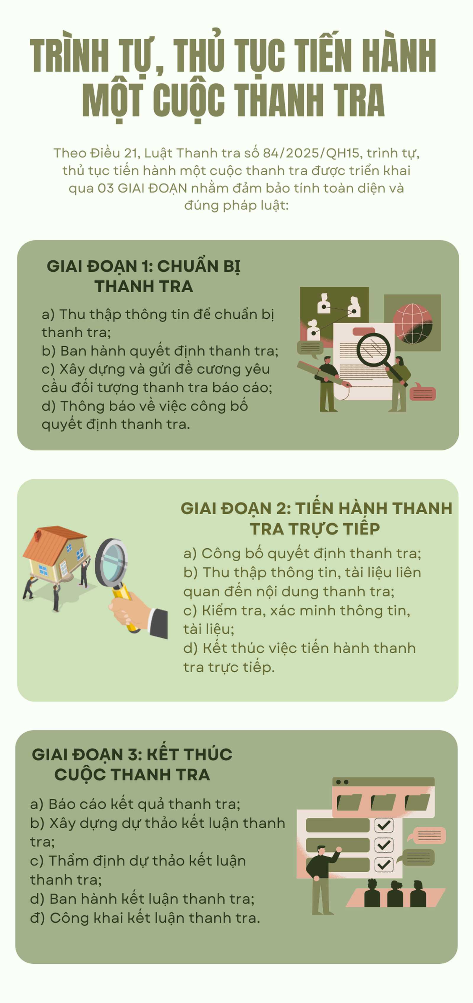 (Thanh tra) - Để đảm bảo tính minh bạch và hiệu quả trong quản lý nhà nước, hoạt động thanh tra tuân thủ một trình tự, thủ tục chặt chẽ, được quy định rõ ràng tại Điều 21, Luật Thanh tra số 84/2025/QH15.