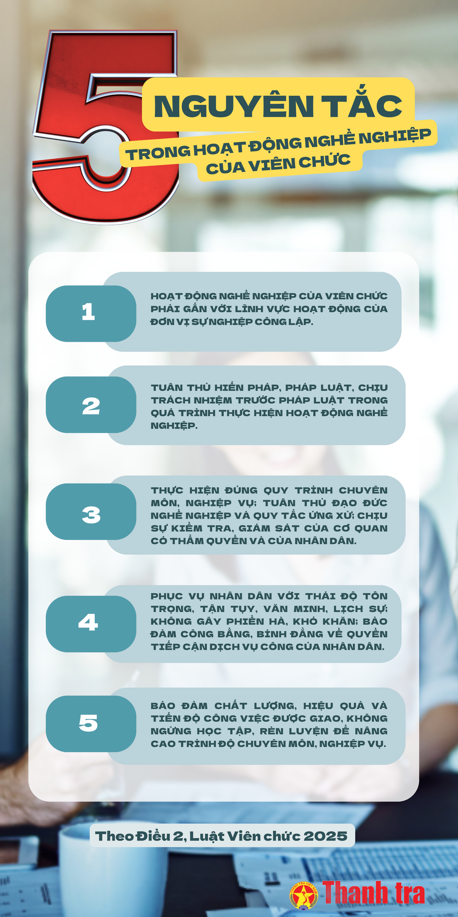(Thanh tra) - Điều 2, Luật Viên chức 2025 quy định 5 nguyên tắc hoạt động nghề nghiệp của viên chức. Trong đó nhấn mạnh, viên chức phải có thái độ tôn trọng, tận tụy, văn minh, lịch sự; không gây phiền hà, khó khăn khi phục vụ Nhân dân.