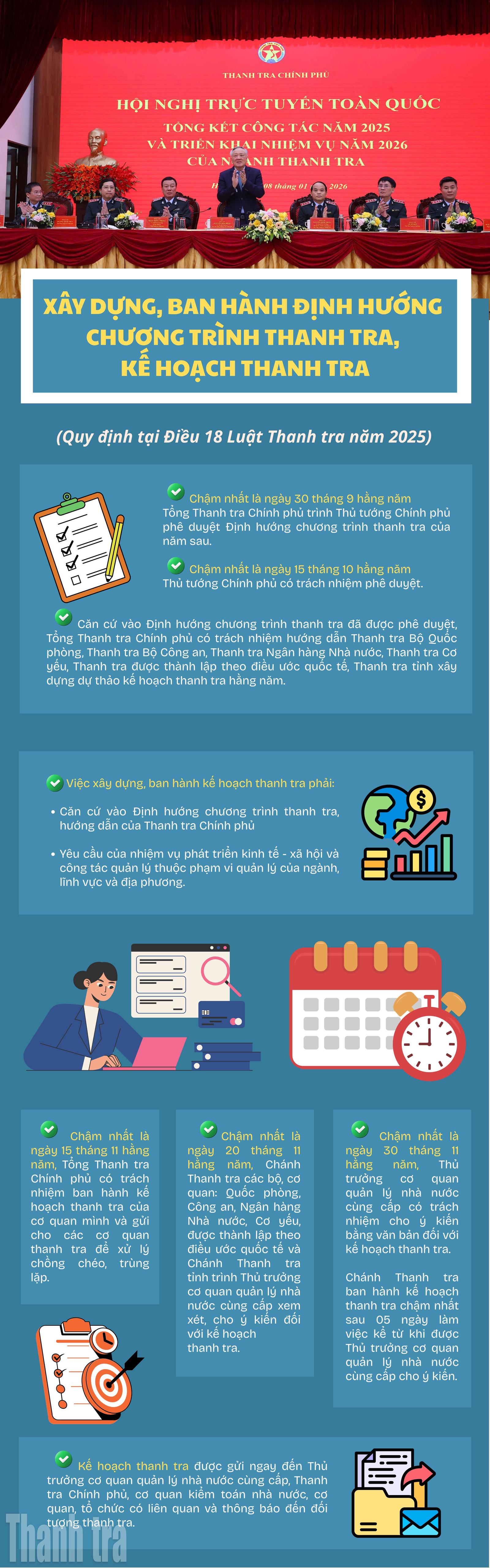 (Thanh tra) - Một trong những nội dung quan trọng về công tác thanh tra là việc xây dựng, ban hành Định hướng chương trình thanh tra, kế hoạch thanh tra. Điều 18 Luật Thanh tra năm 2025 đã quy định chi tiết nội dung này.