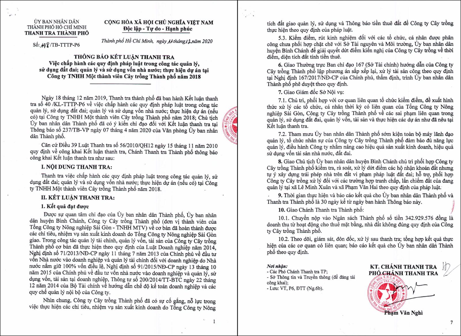 Tại Kết luận thanh tra số 40/KL-TTTP-P6 ngày 18/12/2019 thanh tra việc chấp hành các quy định pháp luật trong công tác quản lý, sử dụng đất đai; quản lý và sử dụng vốn Nhà nước; thực hiện DA tại Công ty TNHH MTV Cây trồng Thành phố (Cty Cây trồng TP) năm 2018, Thanh tra TP đã chỉ ra hàng loạt sai phạm trong việc thực hiện các DA trên phần đất có nguồn gốc Nhà nước giao cho Cty Cây trồng TP.