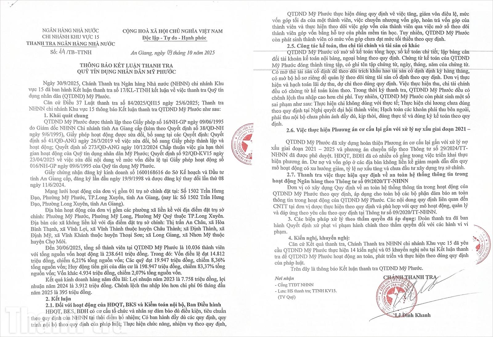Thanh tra Ngân hàng Nhà nước Chi nhánh khu vực 15 đã ban hành Văn bản số 44/TB-TTNH ngày 9/10/2025 thông báo kết luận thanh tra đối với Quỹ tín dụng nhân dân Mỹ Phước (tỉnh An Giang). Kết quả thanh tra cho thấy, bên cạnh những mặt tích cực, Quỹ tín dụng nhân dân Mỹ Phước vẫn còn một số sai phạm trong quá trình hoạt động.