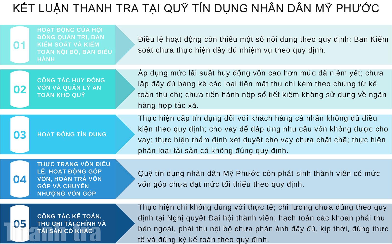 Kết quả thanh tra cũng chỉ ra Quỹ tín dụng nhân Mỹ Phước còn phát sinh một số sai phạm liên quan đến công tác kế toán, thu chi tài chính và tài sản có khác. Cụ thể, đơn vị thực hiện chi không đúng với thực tế; chi lương chưa đúng theo quy định tại Nghị quyết Đại hội thành viên; hạch toán các khoản phải thu bên ngoài, phải thu nội bộ chưa phản ánh đầy đủ, kịp thời, đúng thực tế và đúng kỳ kế toán theo quy định…