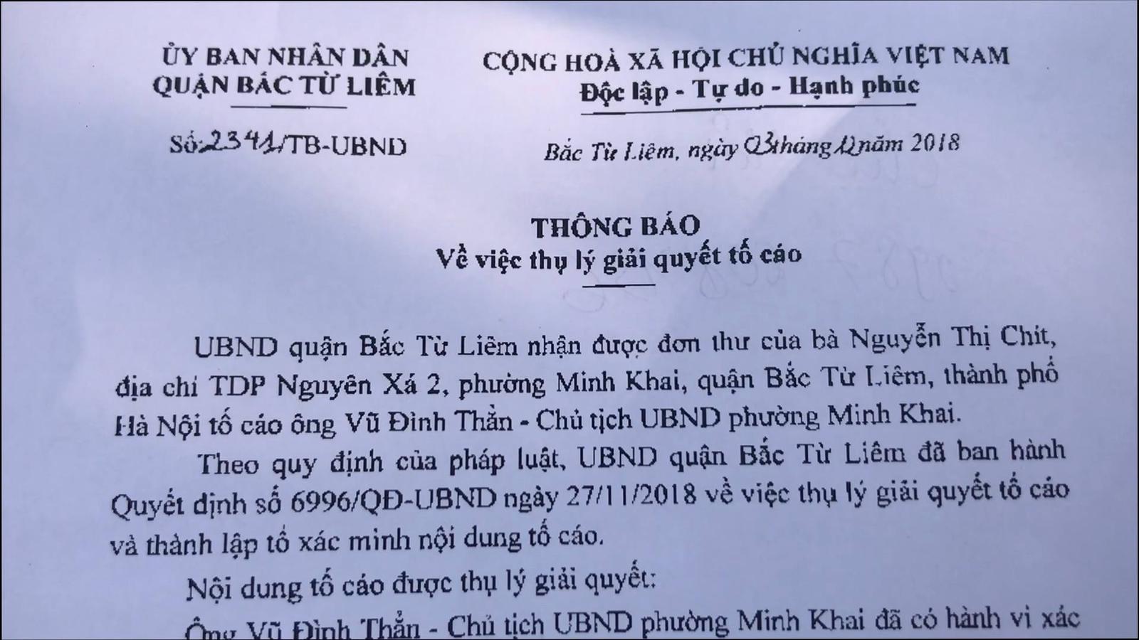 Ngày 12/4/2019, UBND quận Bắc Từ Liêm đã ban hành Kết luận số 19 về nội dung tố cáo của công dân đối với ông Vũ Đình Thẳn, Chủ tịch UBND phường Minh Khai vì đã lập Biên bản số 756 ngày 17/4/2018 về việc xử lý vi phạm hành chính trong lĩnh vực đất đai đối với bà Nguyễn Thị Chít, trong đó xác định diện tích đất bà Chít đang sử dụng là đất công do UBND phường Minh Khai quản lý là không đúng.