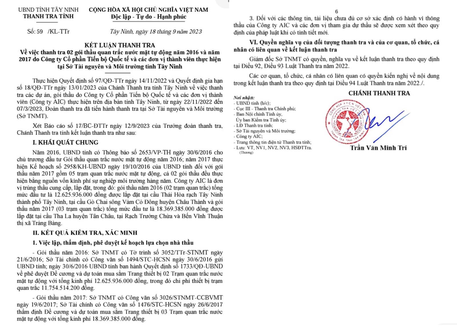 KLTT số 59/KL-TTr của Chánh Thanh tra tỉnh Tây Ninh. Ảnh: TH