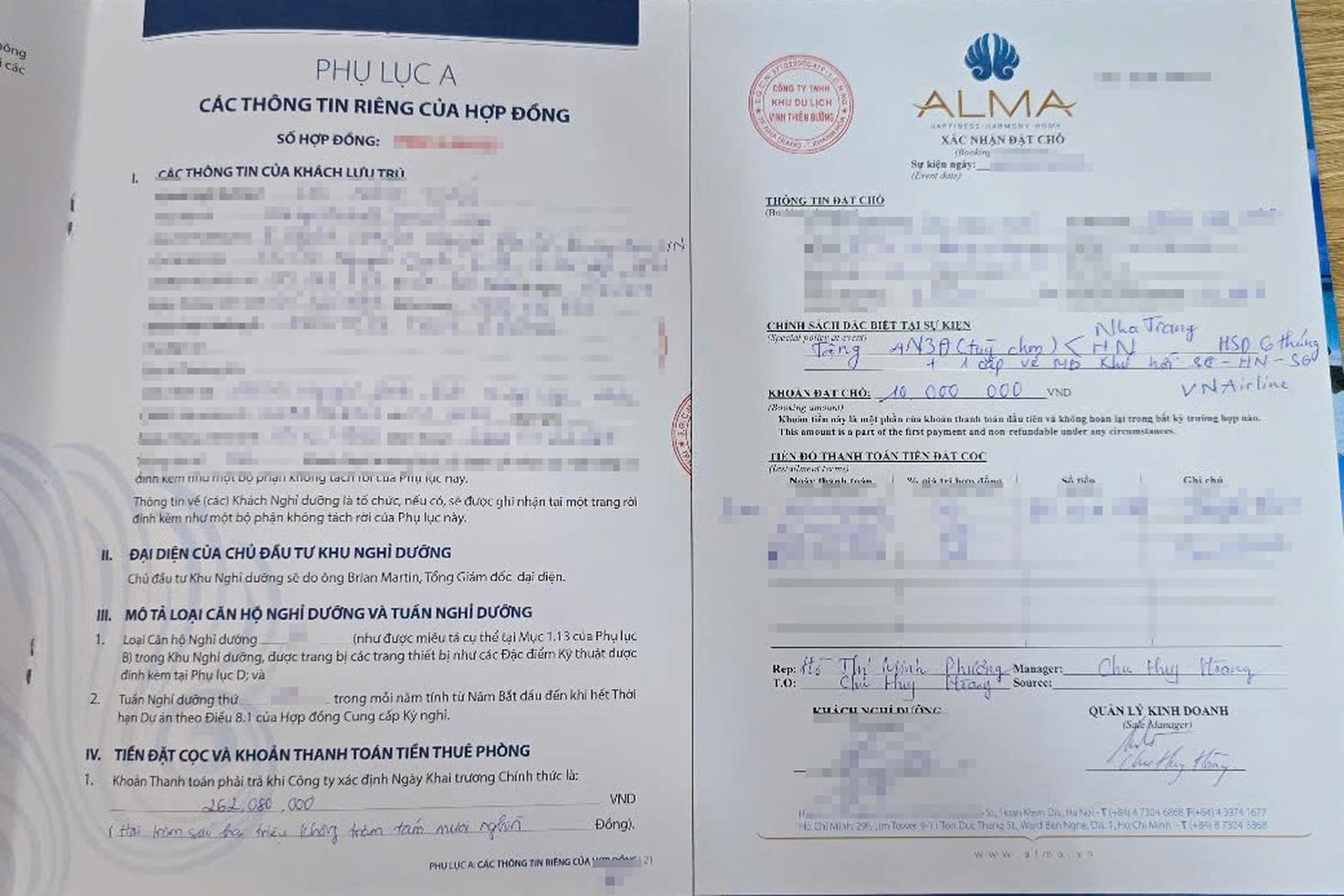 Ảnh chụp liên quan đến nội dung hợp đồng và xác nhận đặt chỗ của một chủ sở hữu kỳ nghỉ tại Khu du lịch Alma. Ảnh: Minh Khoa