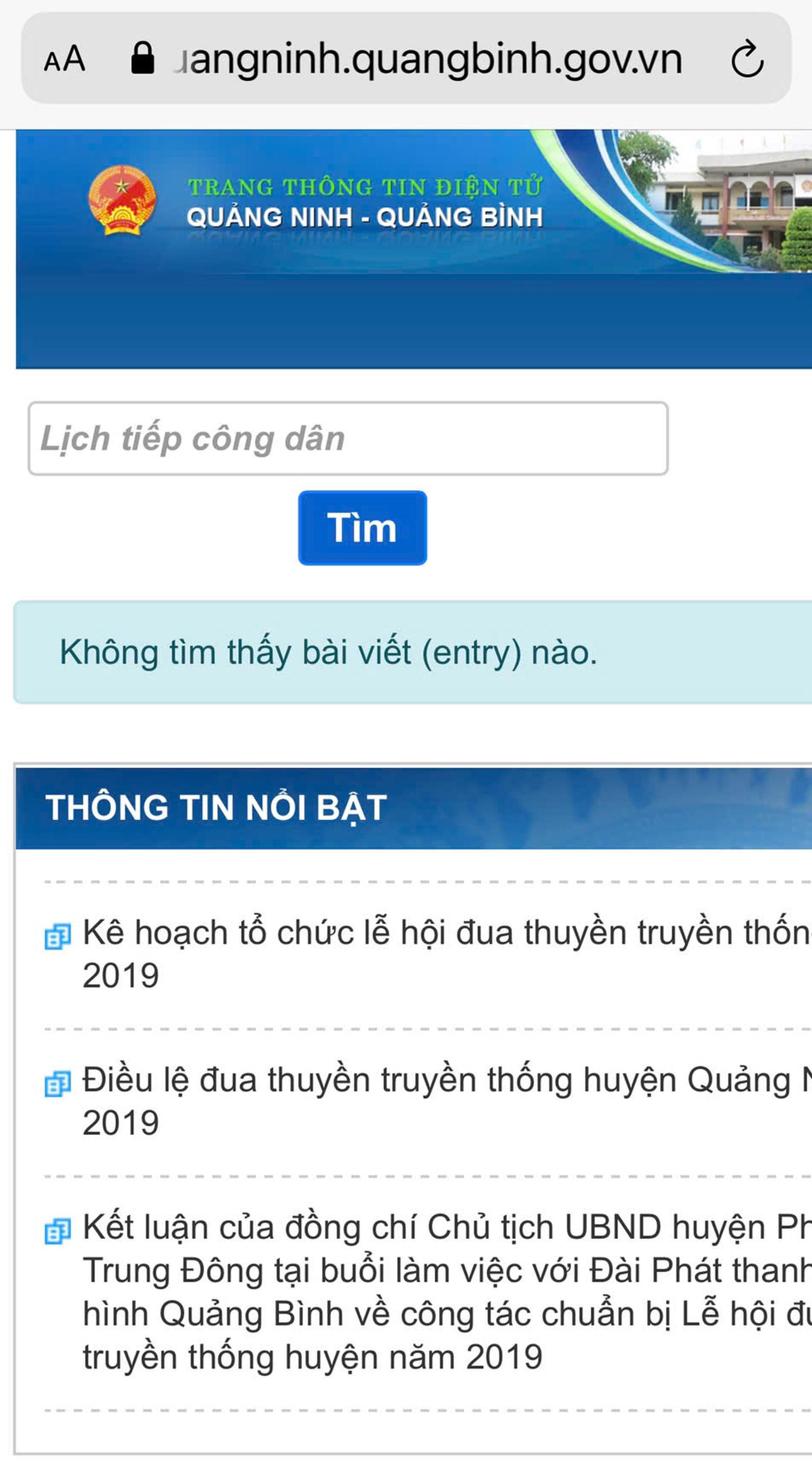 Tại trang web của UBND huyện Quảng Ninh, không tìm thấy kết quả lịch tiếp công dân. Ảnh: LHC