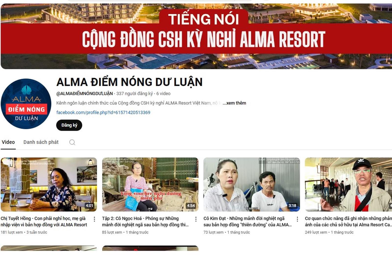 Theo ghi nhận của phóng viên Báo Thanh tra, hiện nay, xuất hiện nhiều kênh thông tin do các chủ sở hữu kỳ nghỉ lập trên nền tảng mạng xã hội như: Trên Youtube có kênh “Alma điểm nóng dư luận”; trên Facebook có trang “Alma Resort - Diễn đàn Chủ Sở Hữu”, “Cộng đồng CSH Kỳ Nghỉ Alma Resort”. Ảnh chụp màn hình: M.K