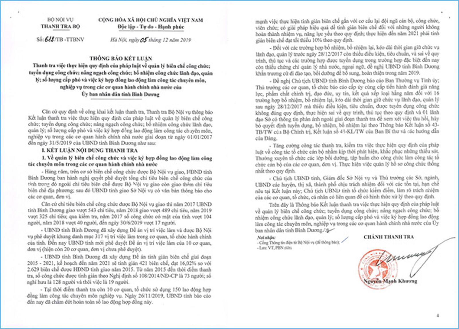 Thanh tra Bộ Nội vụ vừa có thông báo kết luận thanh tra về quản lý, tuyển dụng, nâng ngạch công chức; bổ nhiệm công chức lãnh đạo, quản lý; số lượng cấp phó và việc ký hợp đồng lao động làm công tác chuyên môn, nghiệp vụ trong các cơ quan hành chính nhà nước của UBND tỉnh Bình Dương.