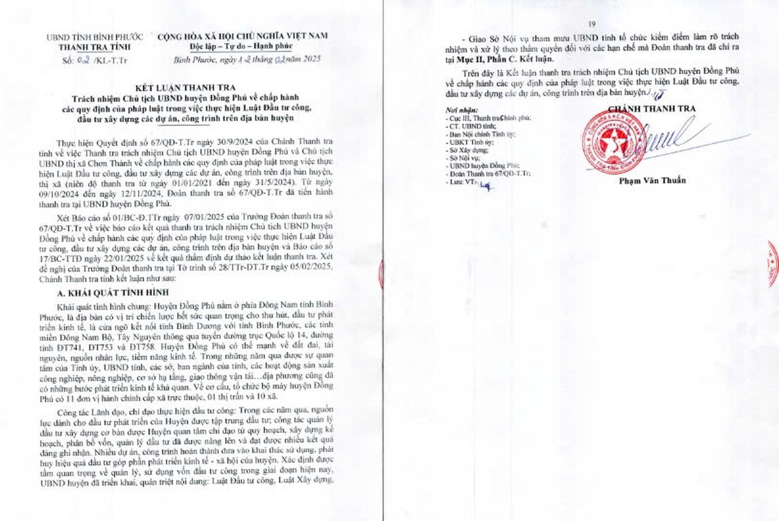 Chánh Thanh tra tỉnh Bình Phước đã ban hành Kết luận thanh tra số 02/KL-T.Tr ngày 12/2/2025, thanh tra trách nhiệm Chủ tịch UBND huyện Đồng Phú về chấp hành các quy định của pháp luật trong việc thực hiện Luật Đầu tư công, đầu tư xây dựng các dự án, công trình trên địa bàn huyện (niên độ thanh tra từ ngày 1/1/2021 đến ngày 31/5/2024).