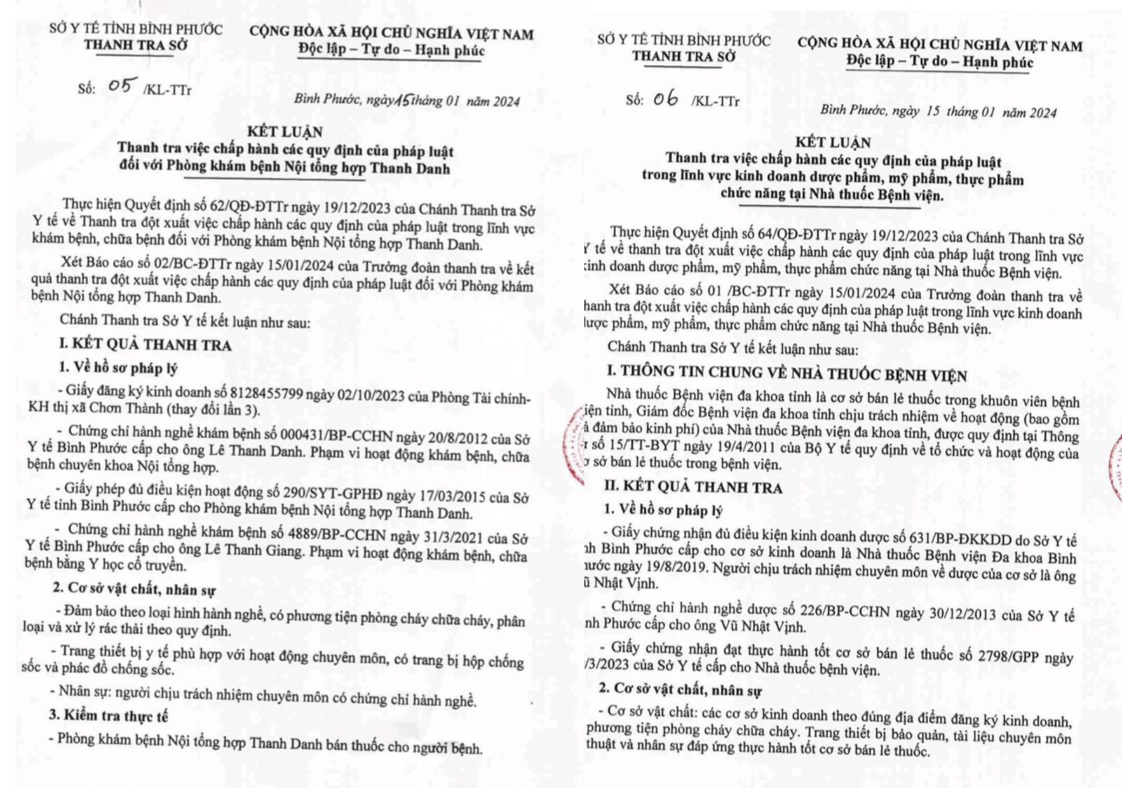 Ngày 15/1/2024, Chánh Thanh tra Sở Y tế tỉnh Bình Phước ban hành Kết luận thanh tra số 05/KL-TTr về thanh tra đột xuất việc chấp hành các quy định của pháp luật trong lĩnh vực khám bệnh, chữa bệnh đối với Phòng Khám bệnh nội tổng hợp Thanh Danh (đăng ký kinh doanh tại thị xã Chơn Thành, tỉnh Bình Phước).