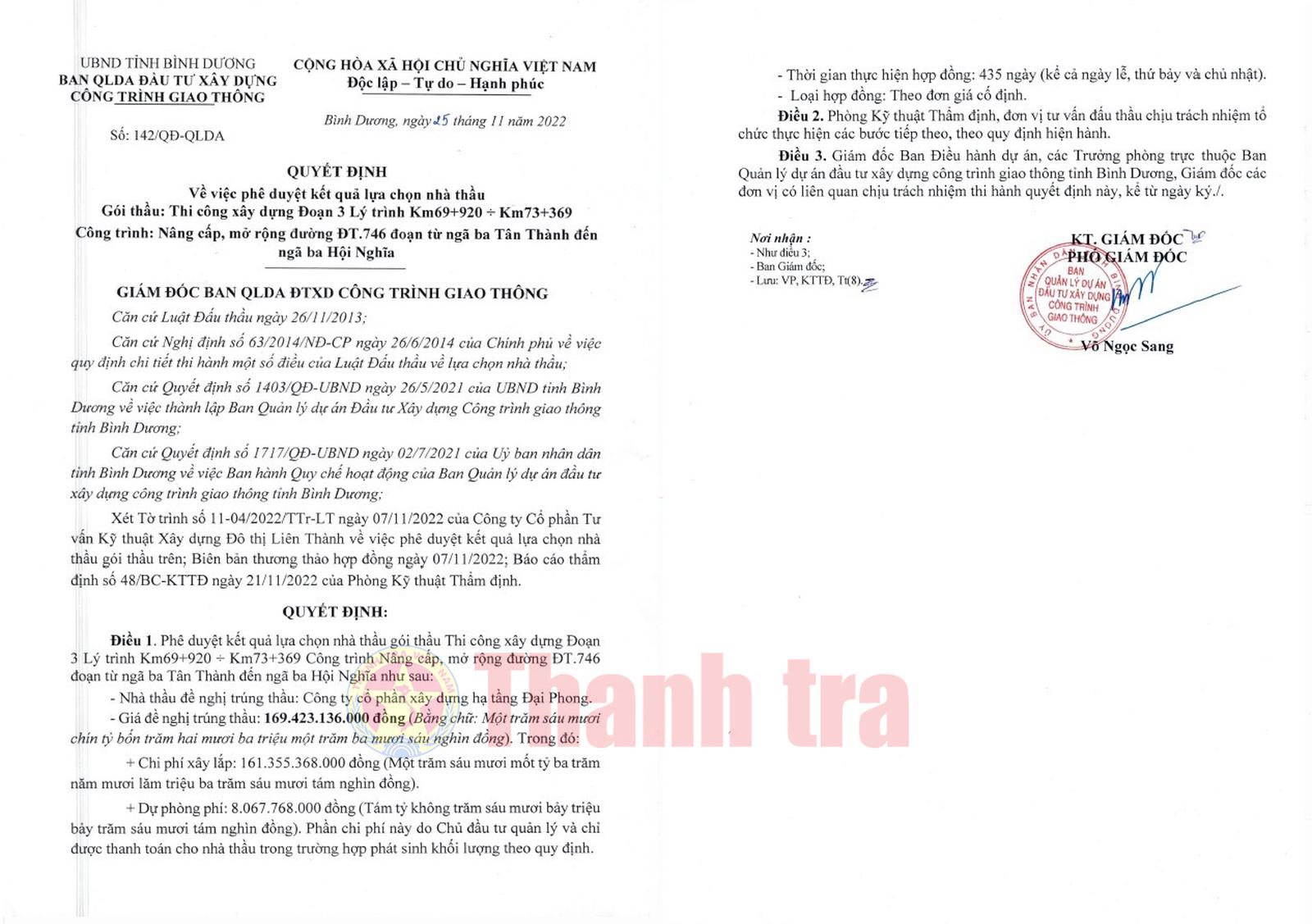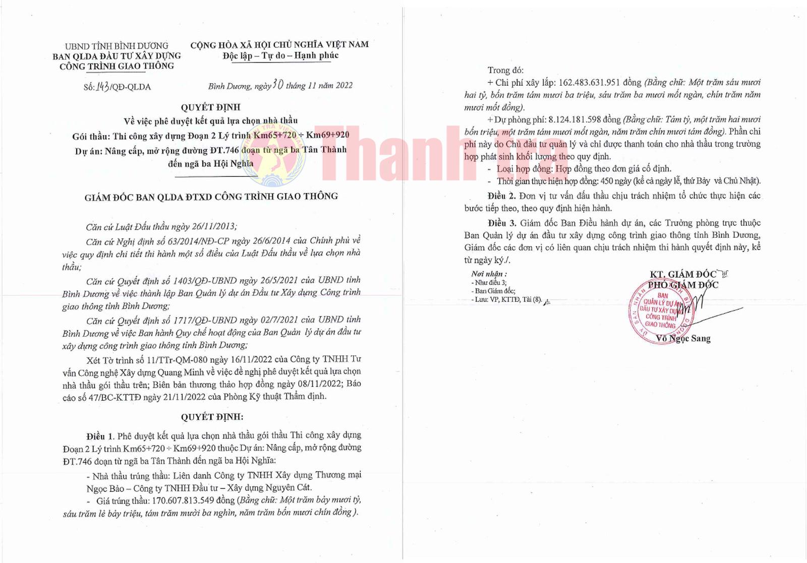 Ngày 30/11/2022, ông Võ Ngọc Sang - Phó Giám đốc BQLDA đầu tư xây dựng công trình giao thông tỉnh Bình Dương ký quyết định phê duyệt Liên danh Công ty TNHH Đầu tư - Xây dựng Nguyên Cát và Công ty TNHH Xây dựng Thương mại Ngọc Bảo trúng thầu. Ảnh: Thùy Dương