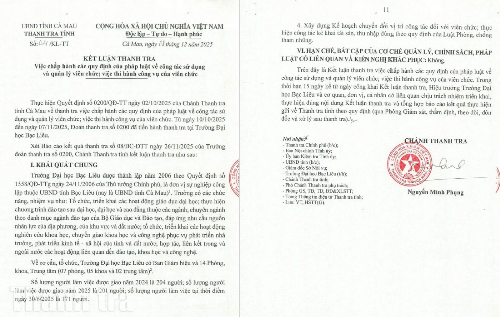 Kết luận thanh tra số 021/KL-TT ngày 8/12/2025 của Thanh tra tỉnh Cà Mau đã chỉ ra nhiều hạn chế, thiếu sót tại Trường Đại học Bạc Liêu. Ảnh: Chu Tuấn
