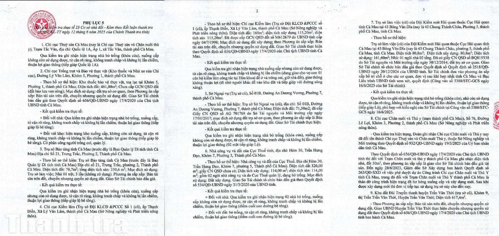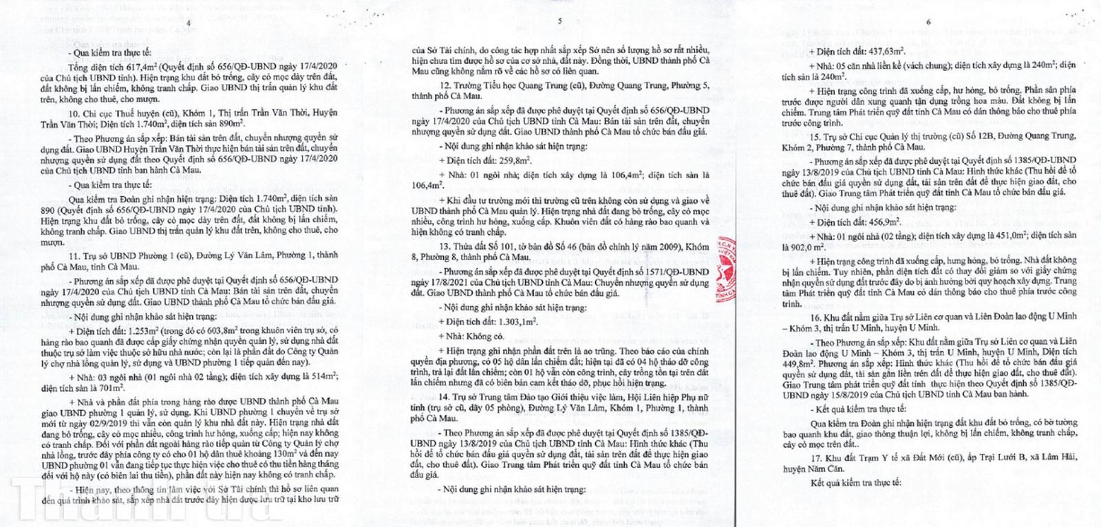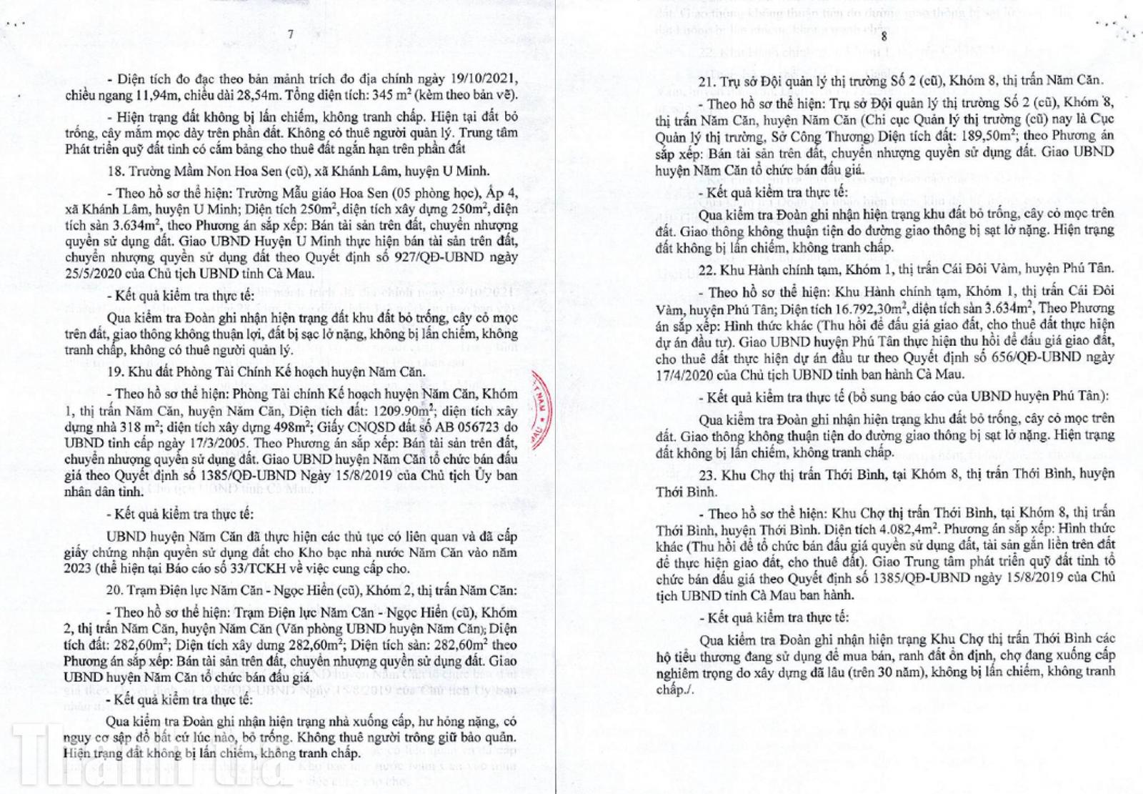 Ngoài ra, qua thanh tra các khu đất, các cơ sở nhà, đất giao UBND các huyện, thành phố Cà Mau bán đấu giá cho thấy, UBND thành phố Cà Mau được giao bán tài sản trên đất, chuyển nhượng quyền sử dụng đất 4 cơ sở, nhưng chỉ có 1 cơ sở đang thực hiện thủ tục bán đấu giá chuyển nhượng quyền sử dụng đất; 3 cơ sở chưa thực hiện. UBND huyện Năm Căn được giao bán tài sản trên đất, chuyển nhượng quyền sử dụng đất 3 cơ sở nhà đất; kết quả đã điều chuyển 1 cơ sở nhà đất, 2 cơ sở nhà đất chưa thực hiện. Còn UBND huyện Trần Văn Thời được giao bán tài sản trên đất, chuyển nhượng quyền sử dụng đất 2 cơ sở, nhưng chỉ có 1 cơ sở đang thực hiện; 1 chưa thực hiện...