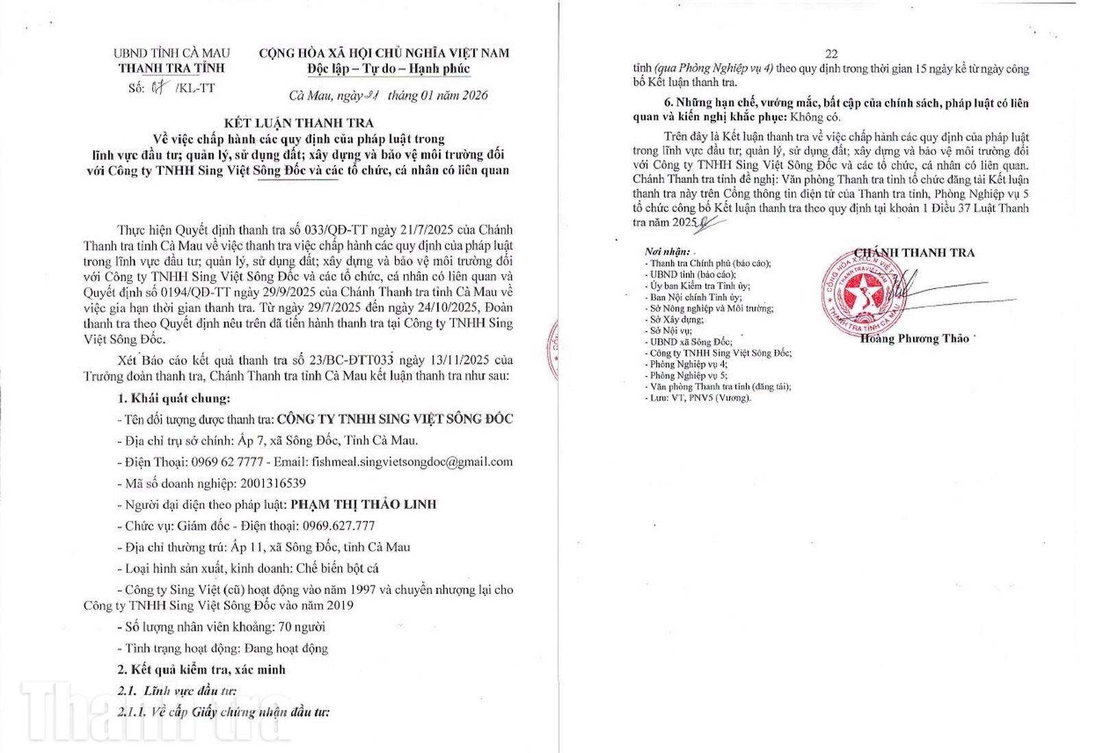 Kết luận thanh tra số 07/KL-TT ngày 21/1/2026 của Thanh tra tỉnh Cà Mau đã chỉ ra nhiều vi phạm tại Công ty TNHH Sing Việt Sông Đốc. Ảnh: Chu Tuấn