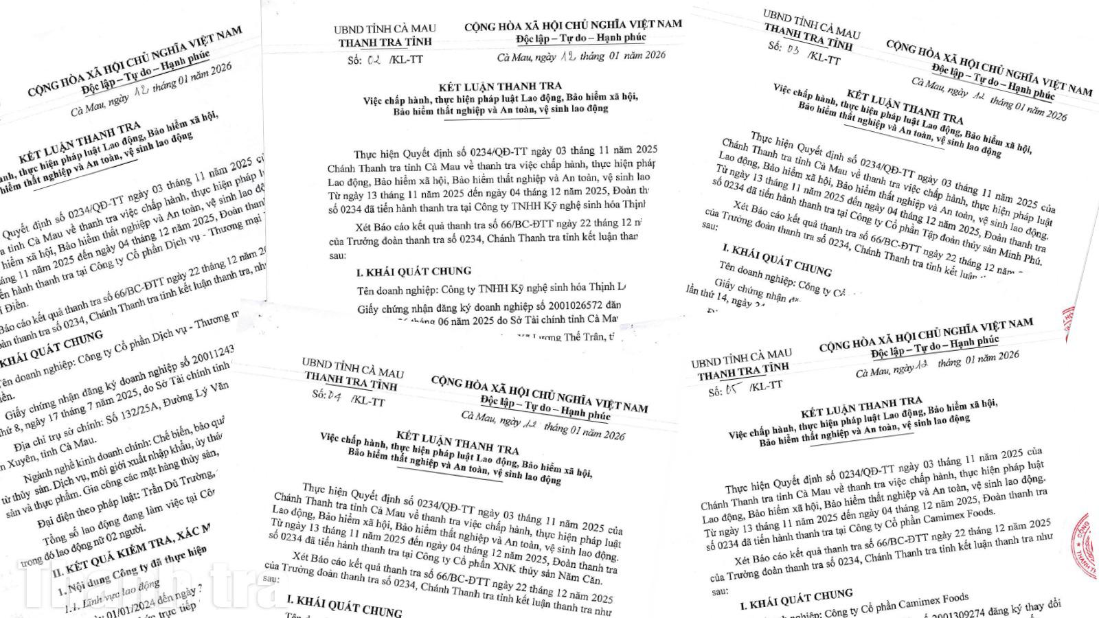Theo các kết luận thanh tra số 01, 02, 03, 04 và 05/KL-TT ngày 12/1/2026, Thanh tra tỉnh Cà Mau đã tiến hành thanh tra tại 5 doanh nghiệp (Công ty Cổ phần Dịch vụ Thương mại XNK Thủy sản Quí Điền; Công ty TNHH Kỹ nghệ Sinh hóa Thịnh Long; Công ty Cổ phần Tập đoàn thủy sản Minh Phú; Công ty Cổ phần XNK Thủy sản Năm Căn; Công ty Cổ phần Camimex Foods) trong việc chấp hành pháp luật lao động, BHXH và ATVSLĐ.