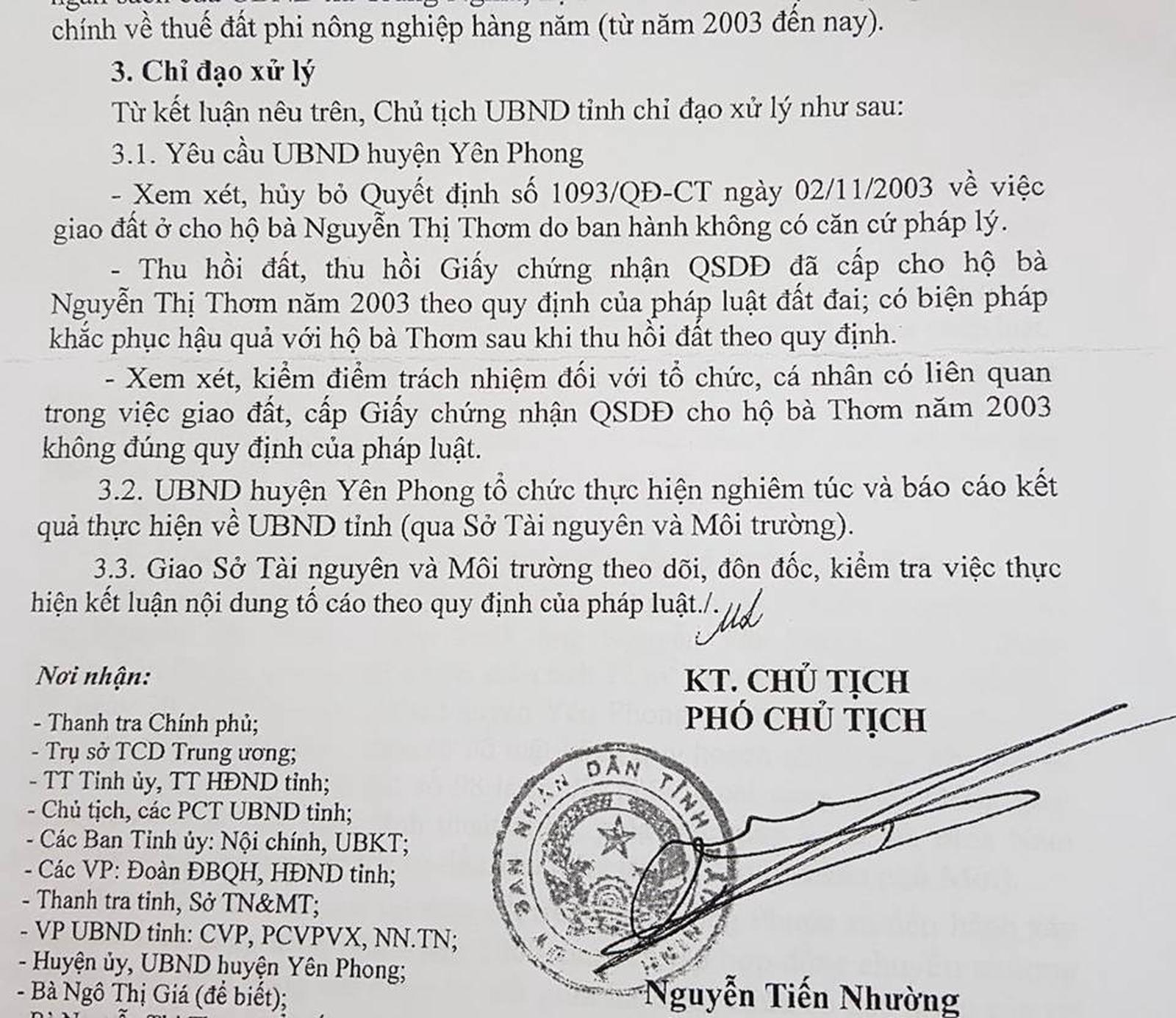 Chủ tịch UBND tỉnh yêu cầu UBND huyện Yên Phong tổ chức thực hiện nghiêm túc nội dung trên, đồng thời, xem xét, kiểm điểm trách nhiệm đối với tổ chức, cá nhân có liên quan trong việc giao đất, cấp Giấy chứng nhận quyền sử dụng đất cho hộ bà Thơm năm 2003 không đúng quy định pháp luật.