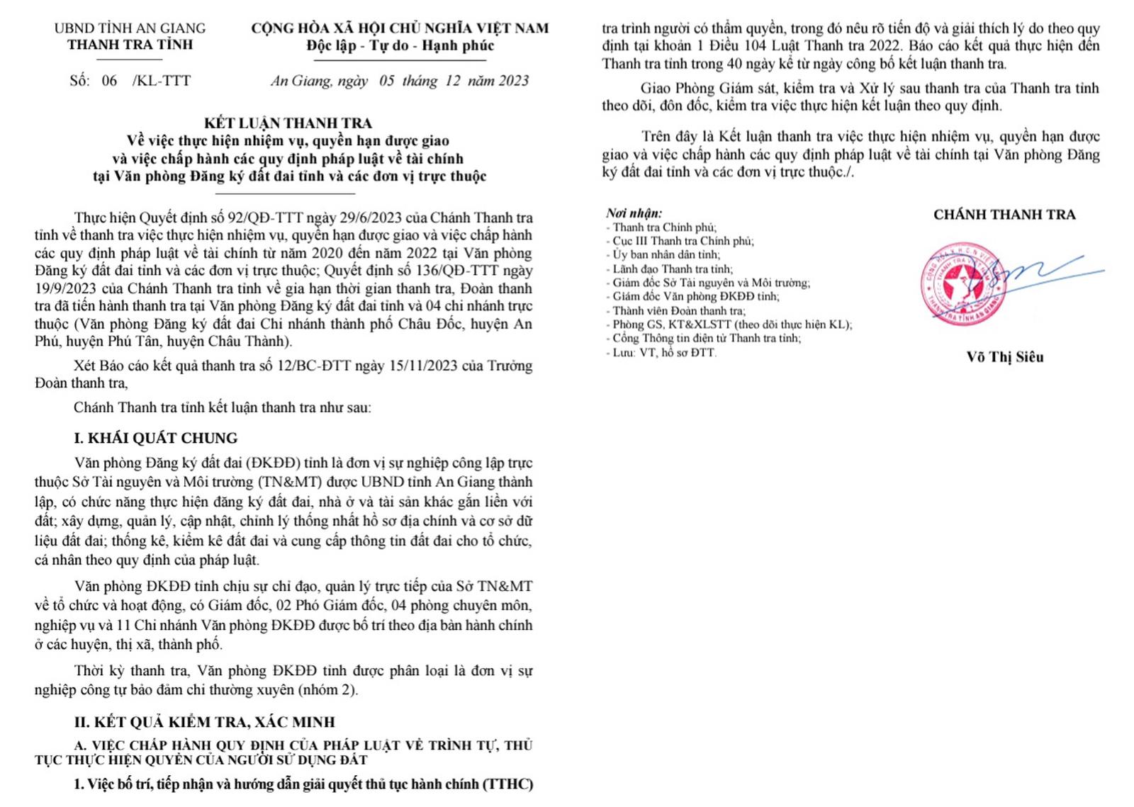Chánh Thanh tra tỉnh An Giang ban hành Kết luận thanh tra số 06/KL-TTT ngày 5/12/2023 về việc thực hiện nhiệm vụ, quyền hạn được giao và việc chấp hành các quy định pháp luật về tài chính tại Văn phòng ĐKĐĐ tỉnh và các đơn vị trực thuộc (gồm 4 chi nhánh Văn phòng ĐKĐĐ tại TP Châu Đốc, huyện An Phú, huyện Phú Tân và huyện Châu Thành).