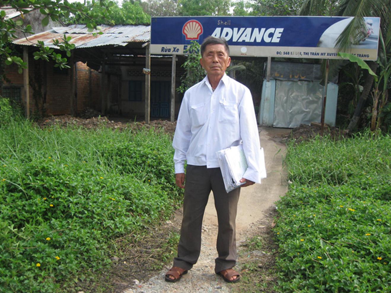 Ông Trung với tập hồ sơ thắng kiện trước căn nhà 568 Lê Lợi, thị trấn Mỹ Xuyên. Ảnh: Trúc Lâm