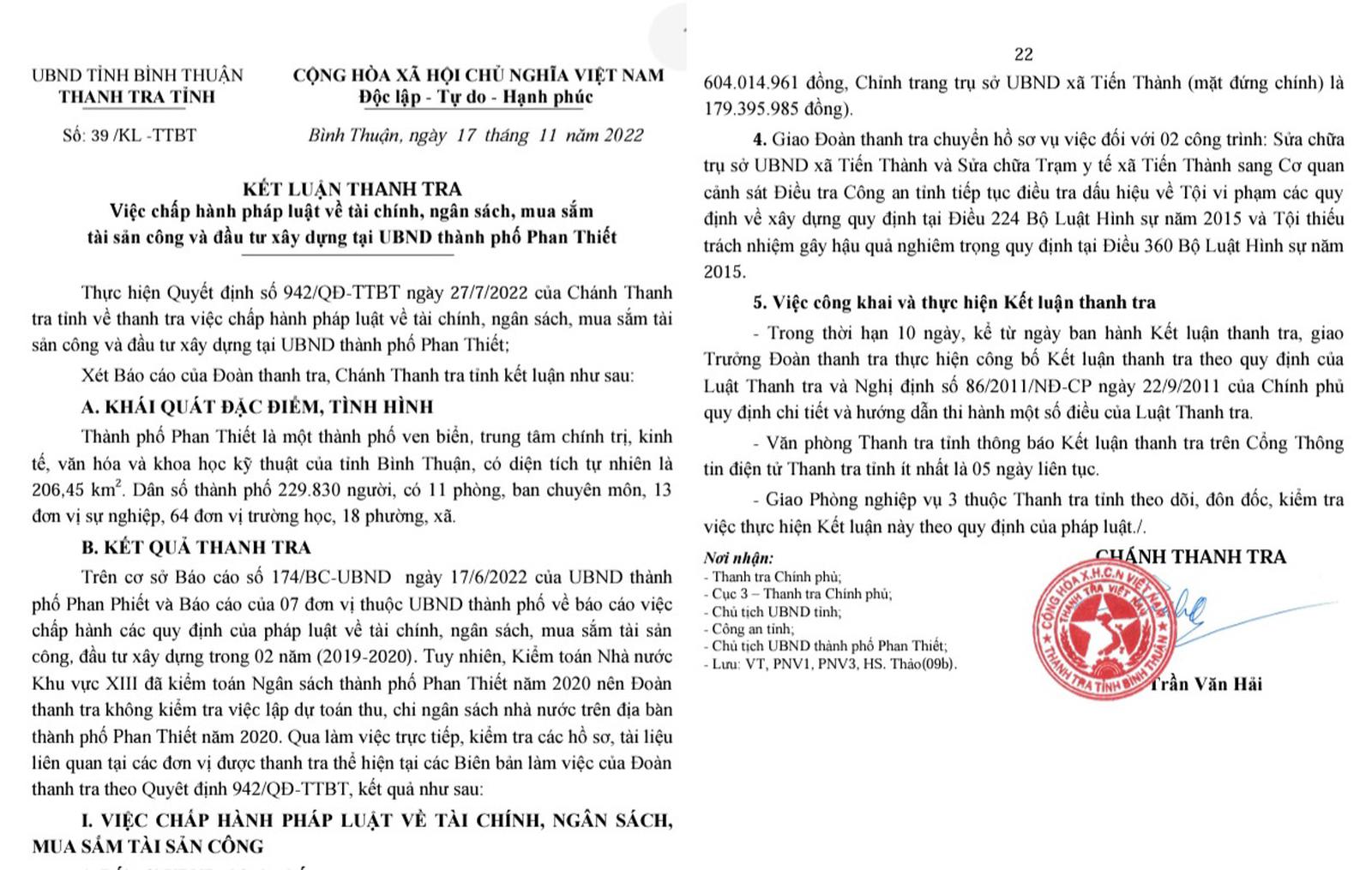 Ngày 17/11/2022, Thanh tra tỉnh Bình Thuận ban hành Kết luận thanh tra số 39/KL-TTBT về việc chấp hành pháp luật về tài chính, ngân sách, mua sắm tài sản công và đầu tư xây dựng tại UBND TP Phan Thiết. Đây là cuộc thanh tra được thực hiện theo Quyết định số 942/QĐ-TTBT ngày 27/7/2022 của Chánh Thanh tra tỉnh Bình Thuận. Thời kỳ thanh tra là các năm 2019 - 2020.