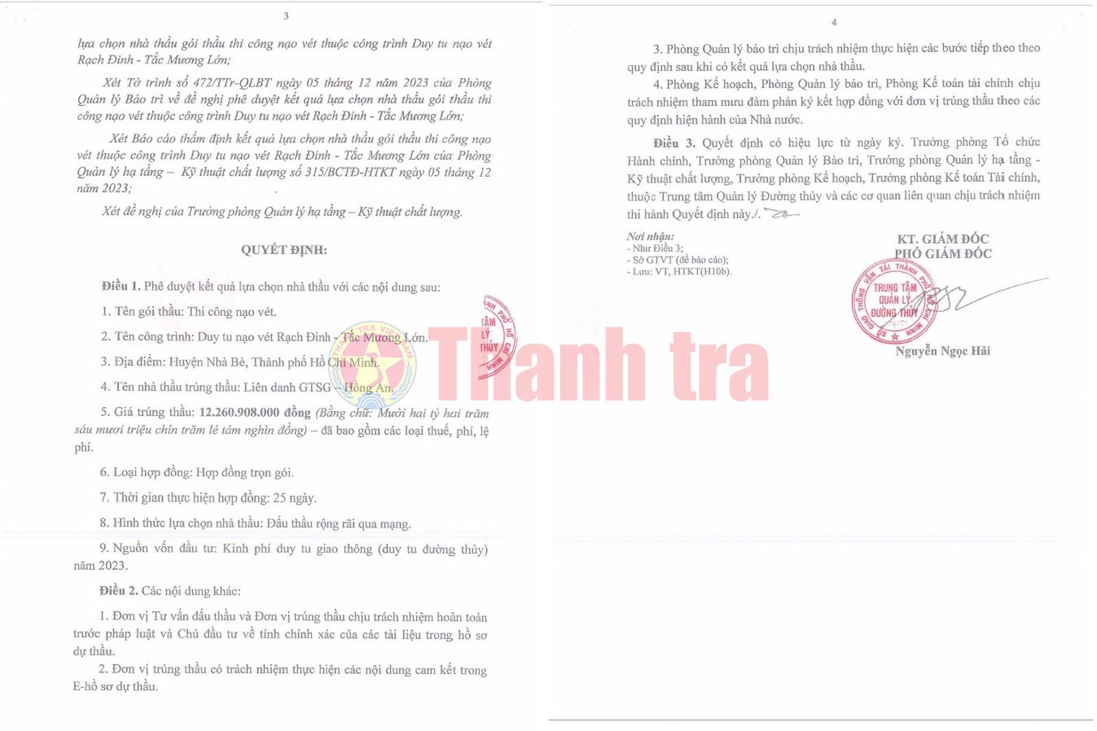 Ngày 5/12/2023, ông Nguyễn Ngọc Hải - Phó Giám đốc Trung tâm Quản lý đường thủy phê duyệt cho Liên danh Công ty CP Công trình giao thông Sài Gòn - Công ty TNHH Thương mại Dịch vụ Thi công xây dựng cầu đường Hồng An trúng gói thầu thi công nạo vét rạch Đinh - Tắc Mương Lớn. Ảnh: Chu Tuấn