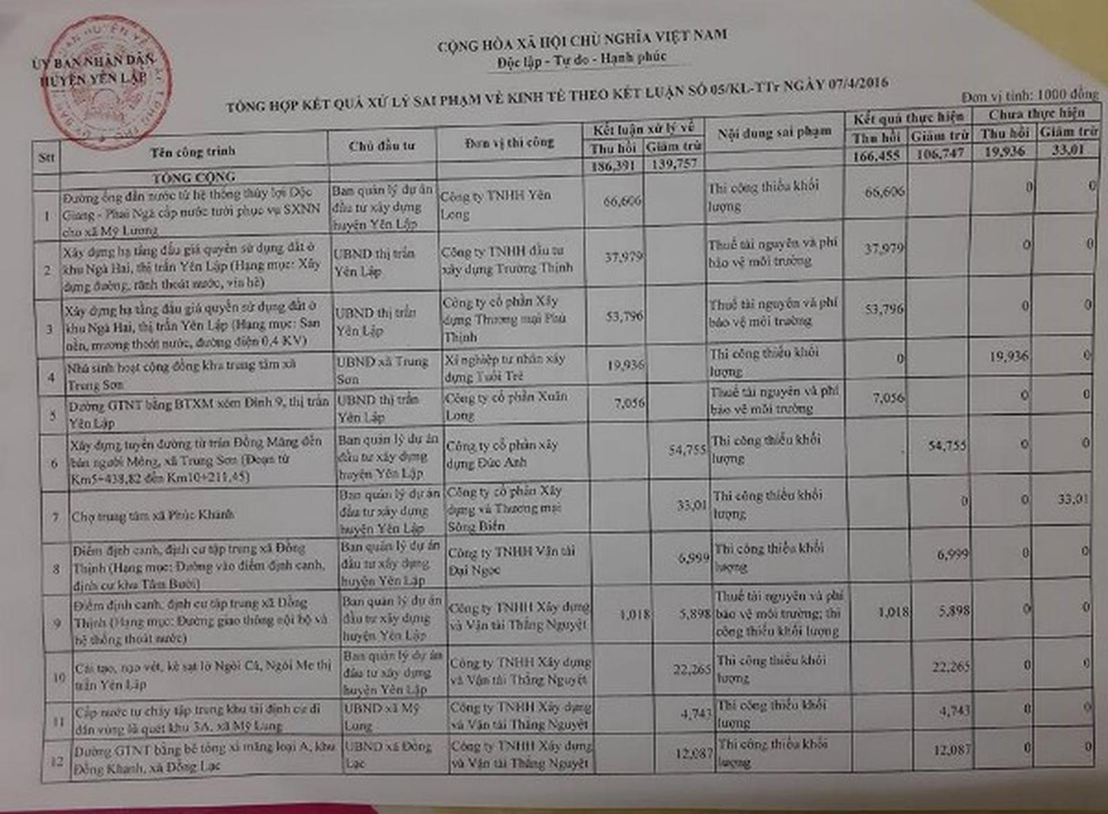 Nhưng cũng theo Bảng tổng hợp kết quả xử lý sai phạm về kinh tế theo Kết luận thanh tra thì thấy có 6/12 công trình do Ban Quản lý dự án đầu tư xây dựng huyện Yên Lập làm chủ đầu tư có sai phạm hơn 189 triệu đồng với các lỗi được ghi nhận là: thi công thiếu khối lượng.
