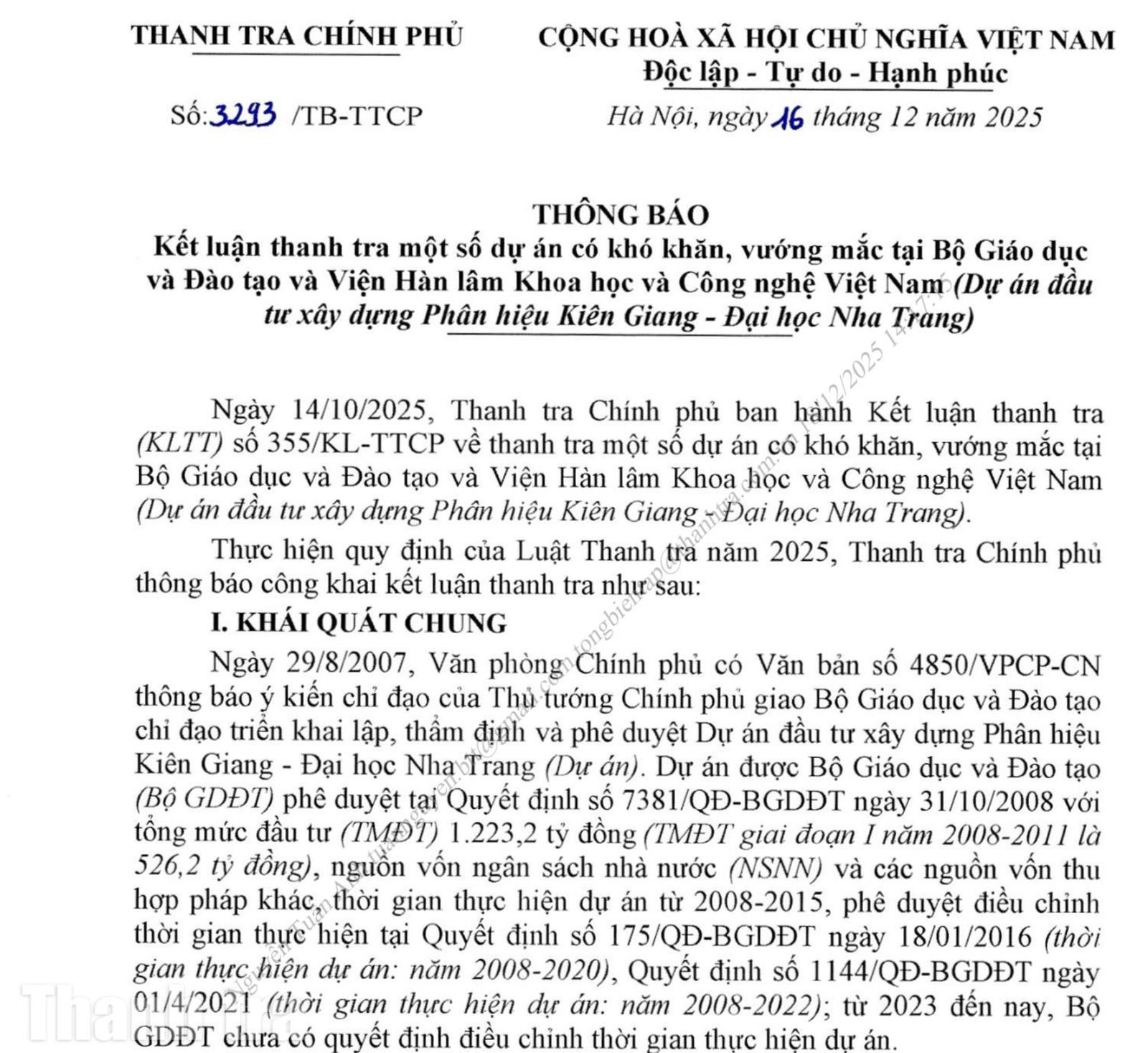 (Thanh tra) - Thanh tra Chính phủ vừa ban hành Thông báo kết luận thanh tra đối với một số dự án có khó khăn, vướng mắc tại Bộ Giáo dục và Đào tạo (GDĐT) và Viện Hàn lâm Khoa học và Công nghệ Việt Nam, trong đó có Dự án đầu tư xây dựng Phân hiệu Kiên Giang, Trường Đại học Nha Trang (Dự án).