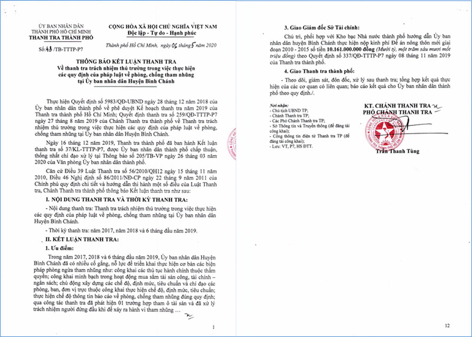 "Trách nhiệm thuộc về Chủ tịch UBND huyện Bình Chánh, Phó Chủ tịch UBND huyện phụ trách theo lĩnh vực, Trưởng phòng Tài chính - Kế hoạch, Trưởng Ban Quản lý dự án nông thôn mới các xã và các tổ chức, cá nhân có liên quan thời kỳ phát sinh vụ việc", thông báo kết luận nêu.
