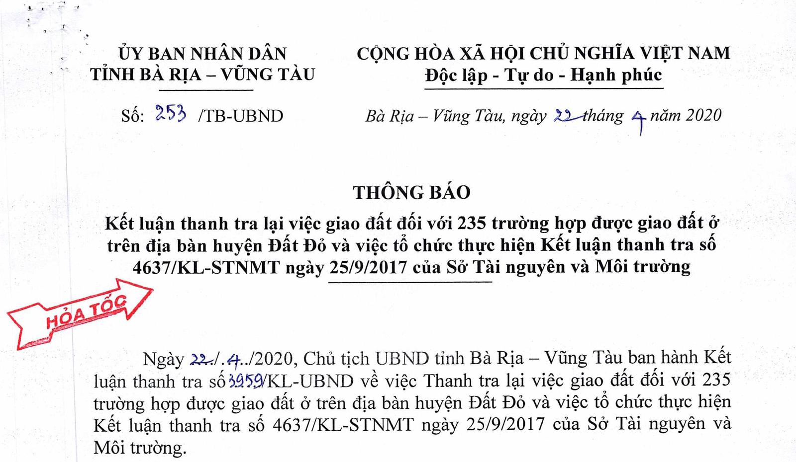 Tại Thông báo kết luận thanh tra số 253/TB-UBND ngày 22/4/2020, Chủ tịch UBND tỉnh BR-VT đã chỉ rõ, chi tiết những sai phạm trong việc giao đất đối với 235 trường hợp được giao đất trên địa bàn huyện Đất Đỏ.