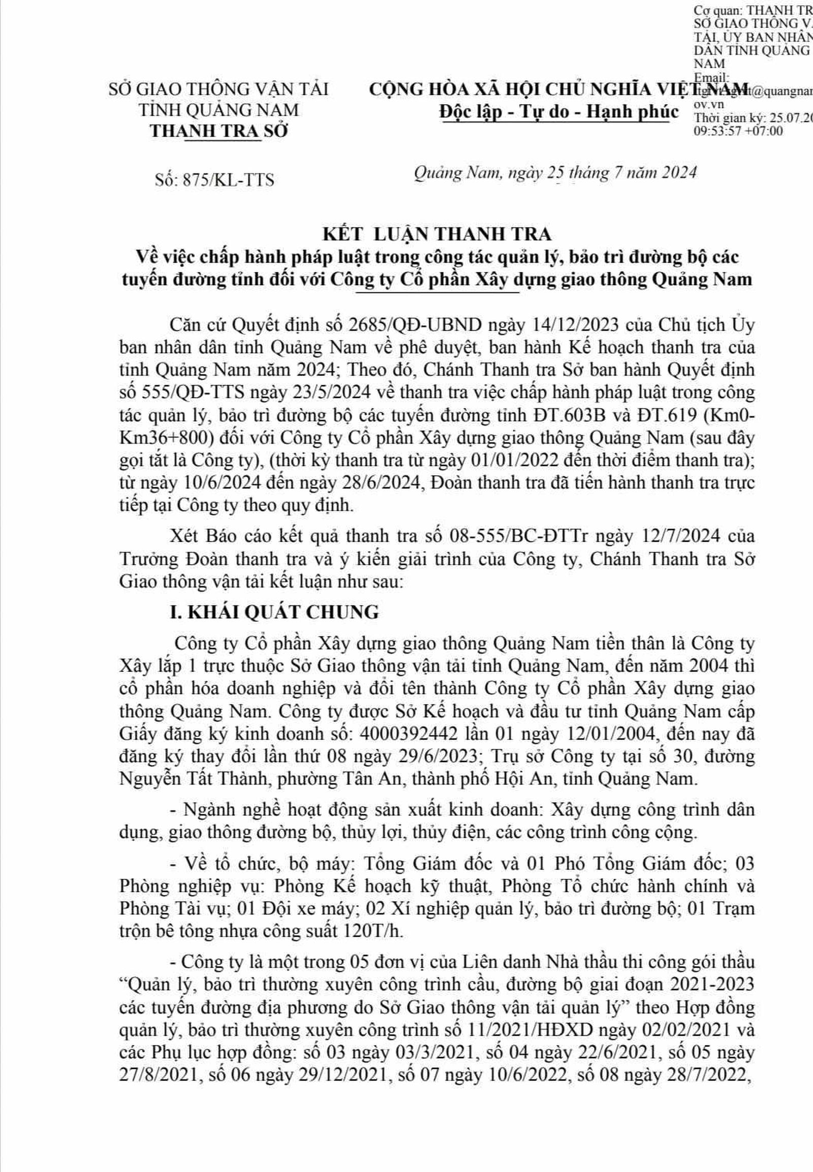 (Thanh tra) - Thanh tra Sở Giao thông vận tải (GTVT) vừa ban hành Kết luận thanh tra số 875/KL-TTS ngày 25/7/2024 về việc chấp hành pháp luật trong công tác quản lý, bảo trì đường bộ các tuyến đường tỉnh đối với Công ty Cổ phần Xây dựng giao thông Quảng Nam.