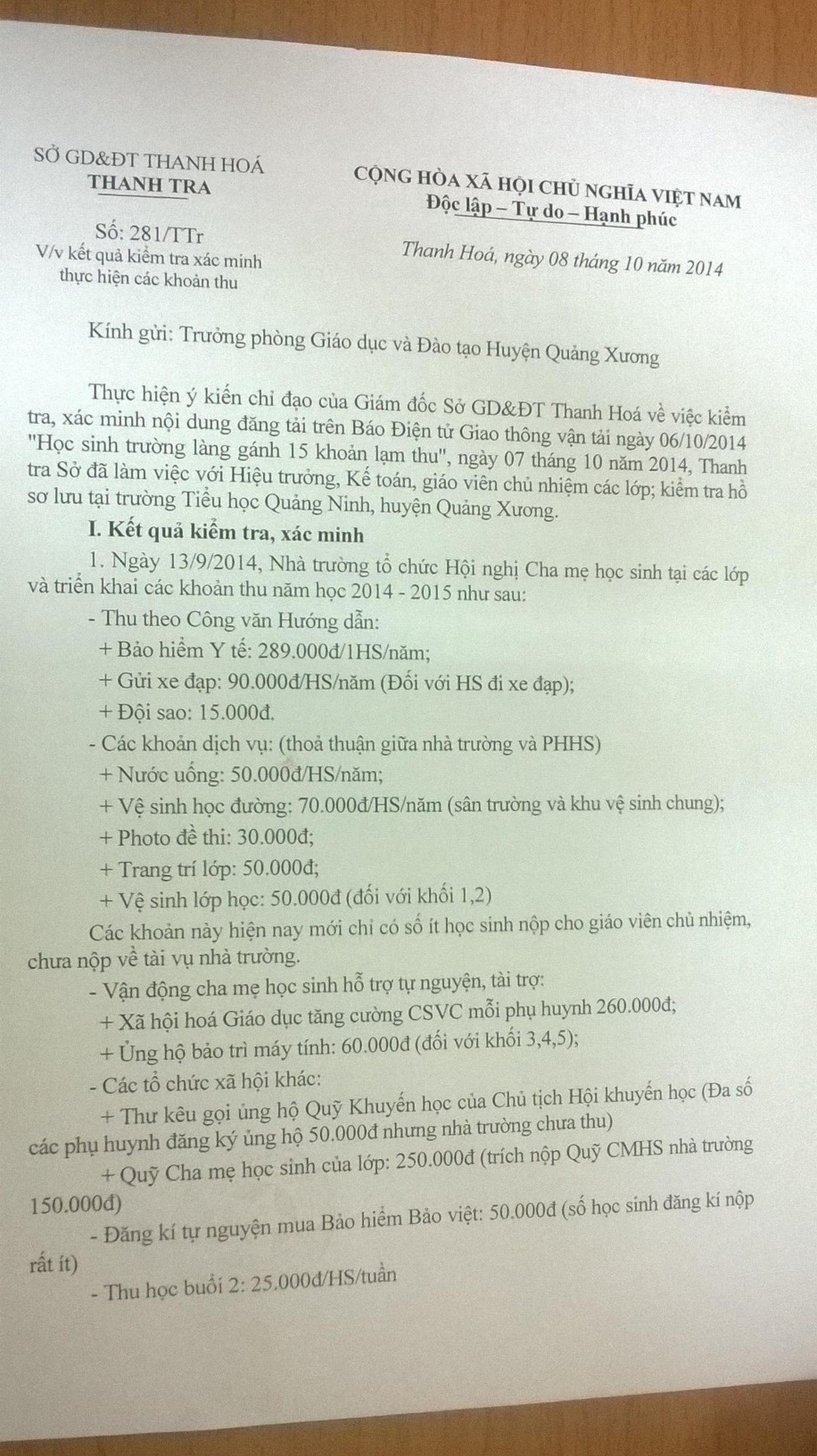 Theo kết quả kiểm tra, xác minh, ngày 13/9/2014, Trường Tiểu học Quảng Ninh đã tổ chức hội nghị cha mẹ học sinh (HS) tại các lớp và triển khai các khoản thu năm học 2014-2015.