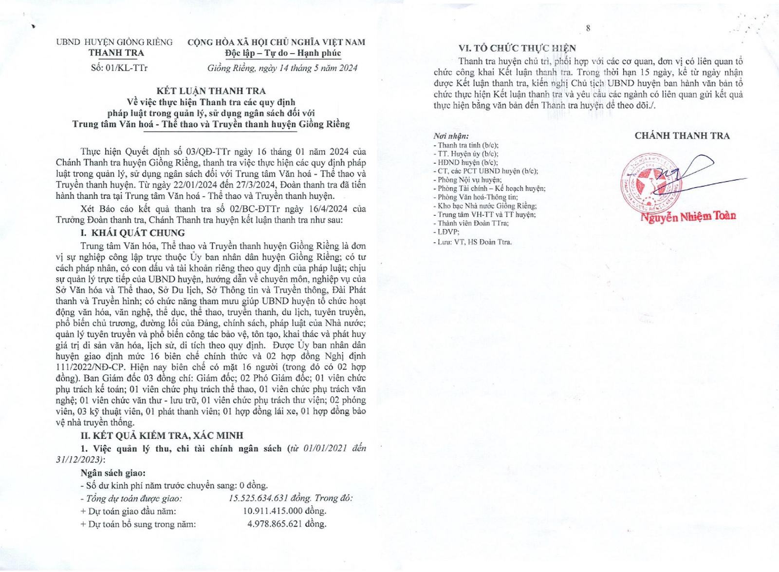 Ngày 14/5/2024, Thanh tra huyện Giồng Riềng đã ban hành Kết luận thanh tra số 01/KL-TTr về thanh tra việc thực hiện các quy định pháp luật trong quản lý, sử dụng ngân sách đối với Trung tâm VHTT&TT huyện (giai đoạn từ ngày 1/1/2021 đến 31/12/2023).