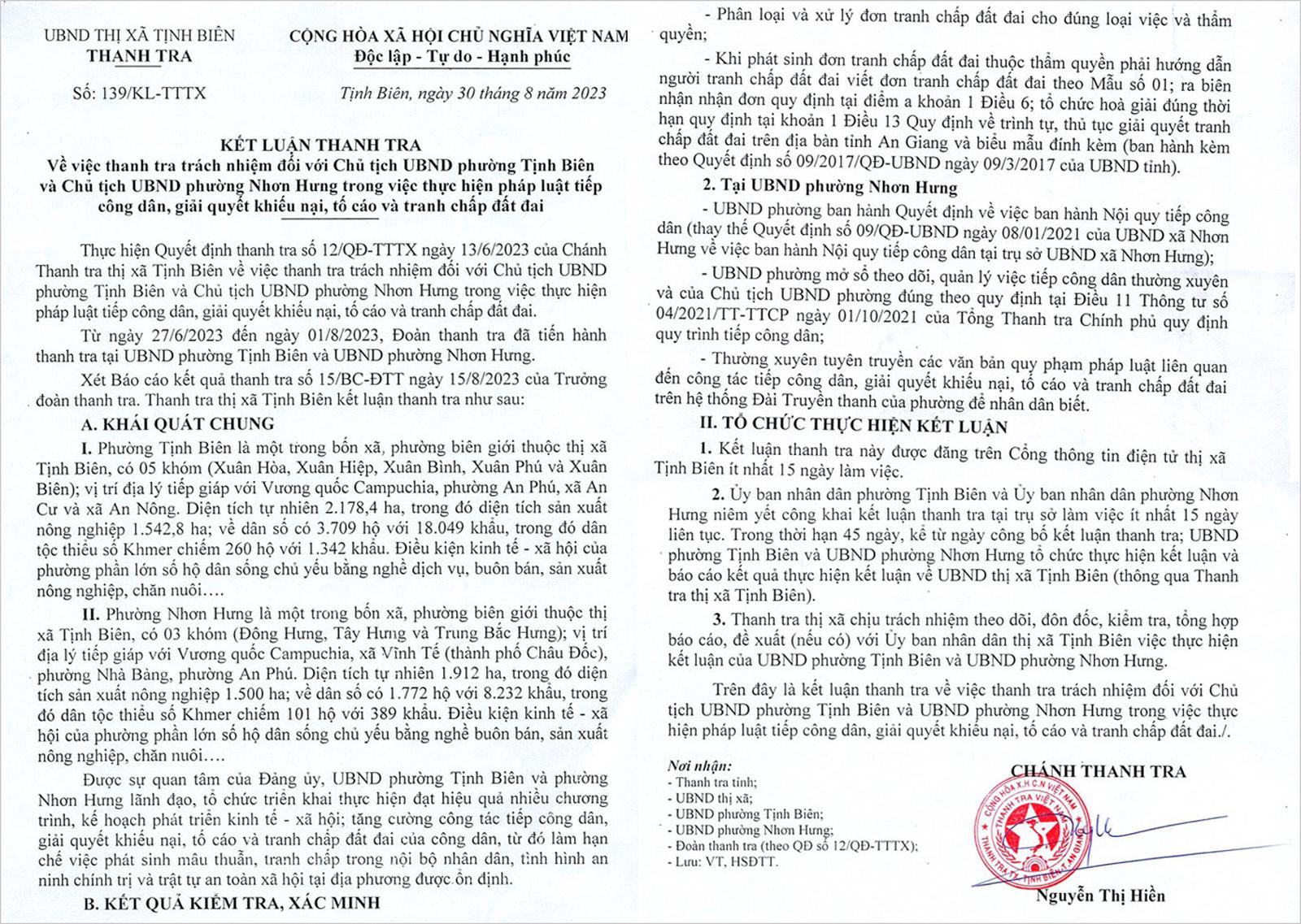 Thanh tra thị xã Tịnh Biên, tỉnh An Giang đã ban hành Kết luận thanh tra số 139/KL-TTTX ngày 30/8/2023 về việc thanh tra trách nhiệm đối với Chủ tịch UBND phường Tịnh Biên và Chủ tịch UBND phường Nhơn Hưng trong việc thực hiện pháp luật tiếp công dân, giải quyết khiếu nại, tố cáo và tranh chấp đất đai.