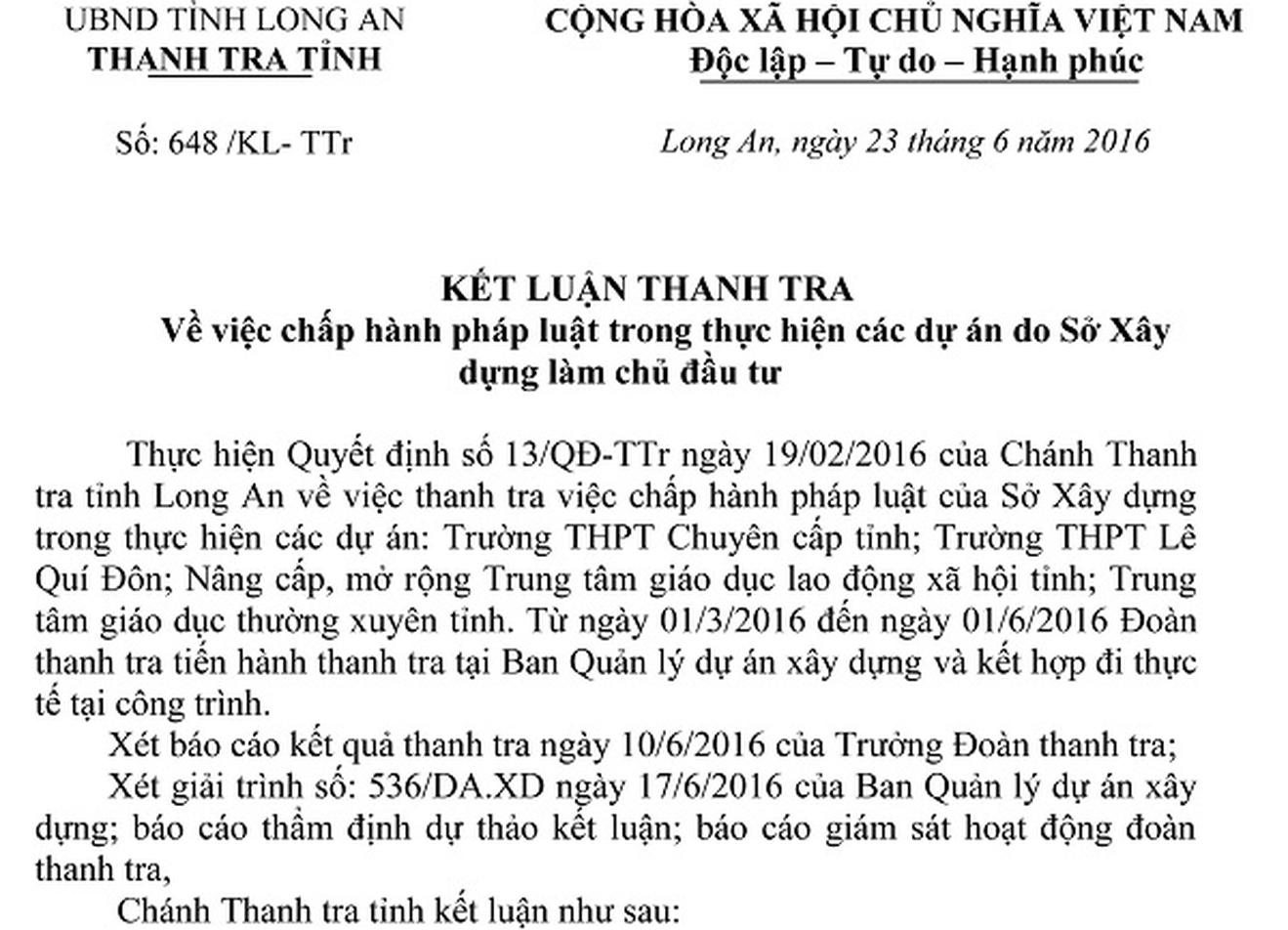 4 D.A được thanh tra gồm: D.A cải tạo nâng cấp trường THPT Lê Quý Đôn; D.A Trung tâm Giáo dục thường xuyên tỉnh; D.A Trường THPT chuyên cấp tỉnh và D.A nâng cấp, mở rộng Trung tâm Giáo dục Lao động Xã hội tỉnh. Các D.A này được UBND tỉnh Long An phê duyệt và giao Sở Xây dựng làm CĐT.