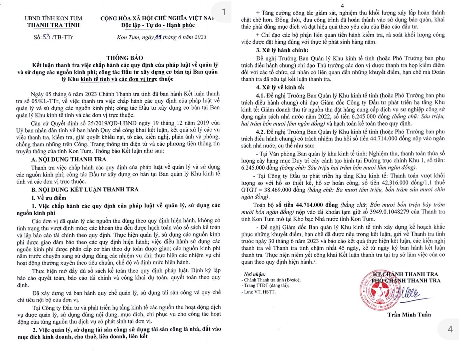 Thông báo kết luận thanh tra của Thanh tra tỉnh Kon Tum. Ảnh: Trần Thọ